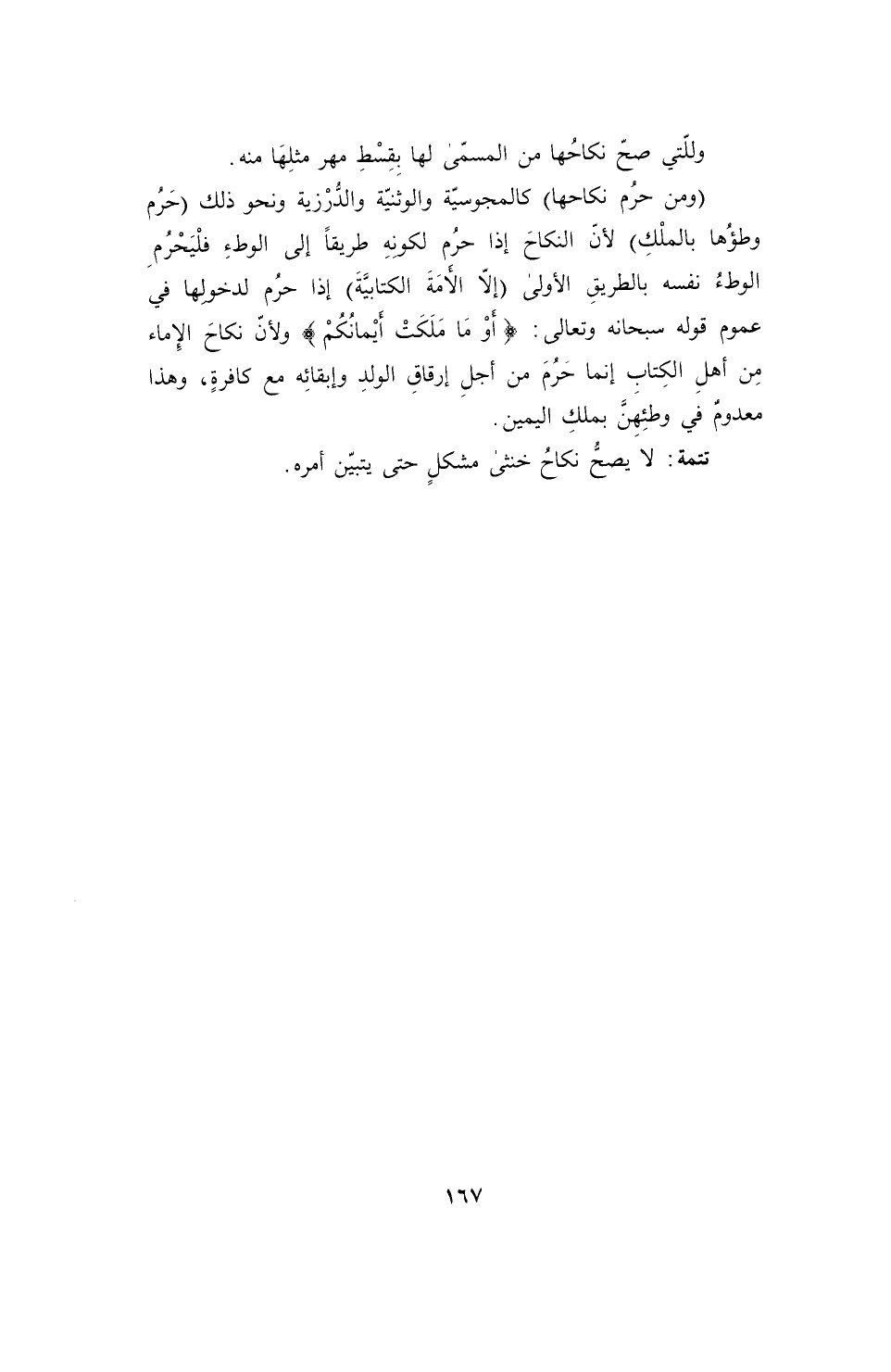 (ومن حرُم نكاحها) كالمجوسيّة والوثنيّة والدُّرْزية ونحو ذلك (حَرُم وطؤُها بالملْكِ) لأنّ النكاحَ إذا حرُم لكونِهِ طريقاً إلى الوطءِ فلْيَحْرُمِ الوطءُ نفسه بالطريقِ الأولى (إلاَّ الأَمَةَ الكتابيَّةَ) إذا حرُم لدخولها في عموم قوله سبحانه وتعالى: {أَوْ مَا مَلَكَتْ أَيْمانُكُمْ} ولأنّ نكاحَ الإِماء مِن أهلِ الكِتاب إنما حَرُمَ من أجلِ إرقاقِ الولدِ وإبقائِه مع كافرةٍ، وهذا معدوم في وطئِهِنَّ بملكِ اليمين.