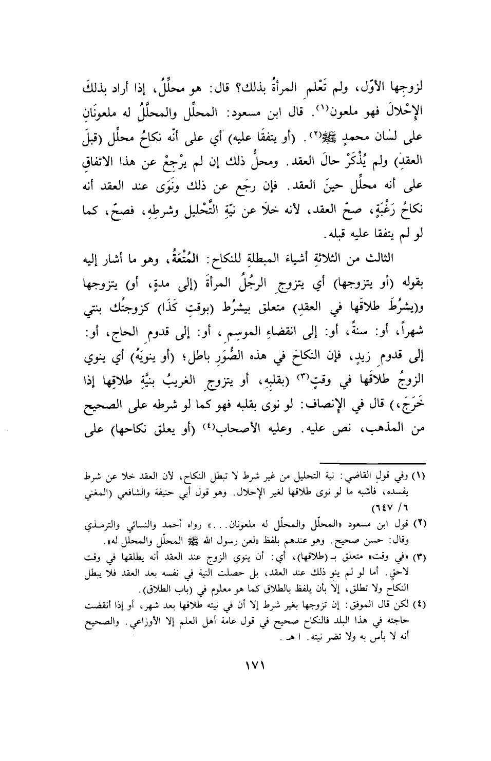 (¬4) لكن قال الموفق: إن تزوجها بغير شرط إلا أن في نية طلاقها بعد شهر، أو إذا أنقضت حاجته في هذا البلد فالنكاح صحيح في قول عامة أهل العلم إلا الأوزاعي. والصحيح أنه لا بأس به ولا تضر نيته. اهـ.