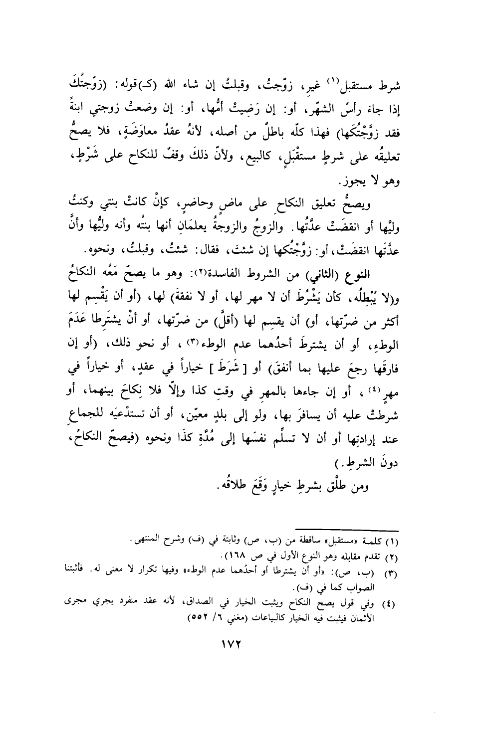 شرط مستقبل (¬1) غيرِ، زوّجتُ، وقبلتُ إن شاء الله (كـ) قوله: (زوَّجتُكَ إذا جاءَ رأسُ الشّهر، أو: إن رَضِيتْ أمُّها، أو: إن وضعتْ زوجتي ابنةً فقد زوَّجْتُكَها) فهذا كلّه باطلٌ من أصله، لأنة عقدُ معاوَضَةٍ، فلا يصحُّ تعليقُه على شرطٍ مستقْبَلٍ، كالبيع، ولأنّ ذلكَ وقفٌ للنكاح على شَرْطٍ، وهو لا يجوز.