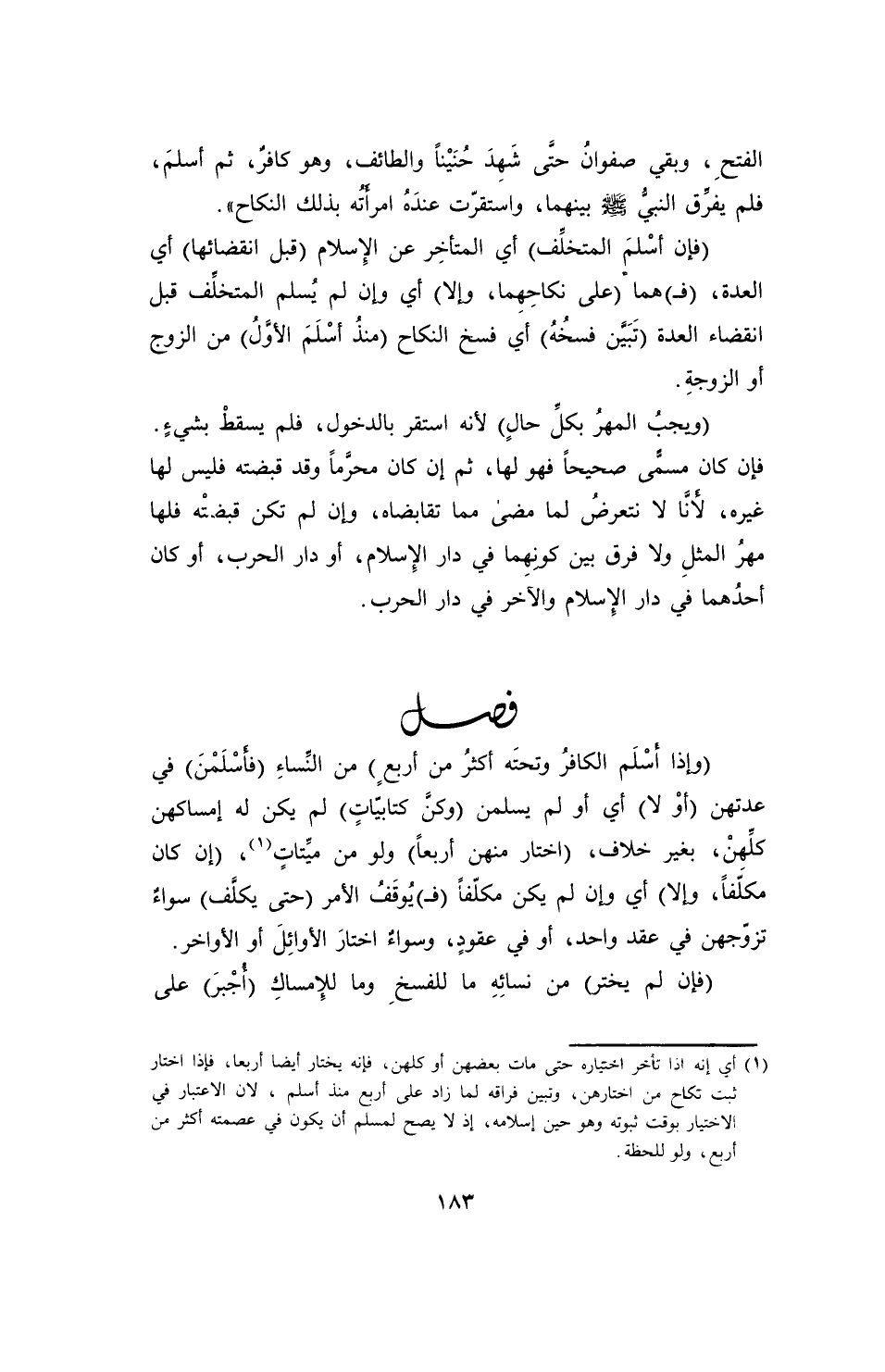 الفتحِ، وبقي صفوانُ حتَّى شَهِدَ حُنَيْناً والطائف، وهو كافرٌ، ثم أسلمَ، فلم يفرِّق النبيُّ - صلى الله عليه وسلم - بينهما، واستقرّت عندَهُ امرأَتُه بذلك النكاح".