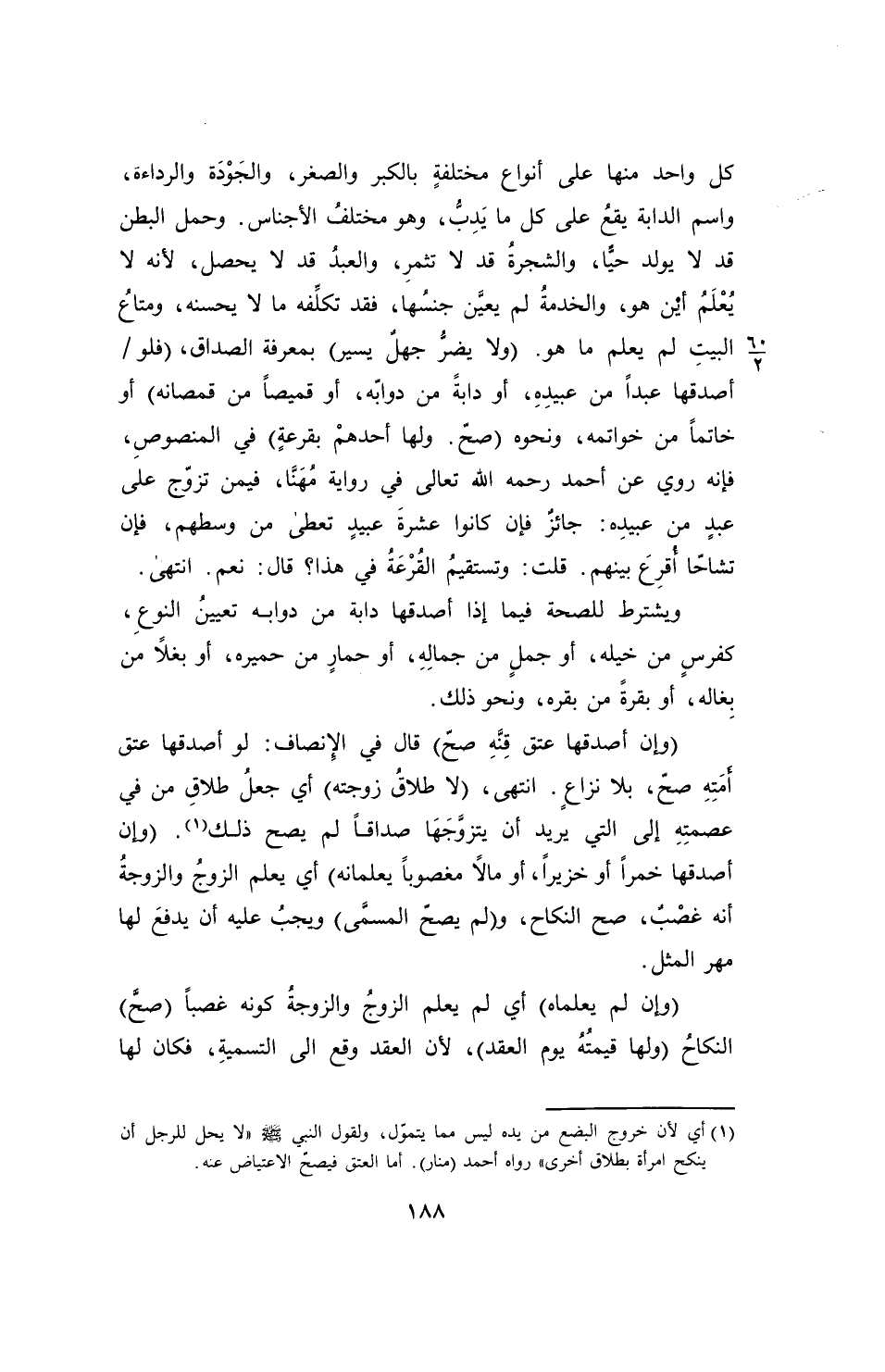 (وإن أصدقها عتق قِنَّهِ صحّ) قال في الإنصاف: لو أصدقها عتق أمتِهِ صحّ، بلا نزاعٍ. انتهى، (لا طلاقُ زوجته) أي جعلُ طلاقِ من في عصمتِهِ إلى التي يريد أن يتزوَّجَهَا صداقاً لم يصح ذلك (¬1). (وإن أصدقها خمراً أو خزيراً، أو مالاً مغصوباً يعلمانه) أي يعلم الزوجُ والزوجةُ أنه غصْبٌ، صح النكاح، و (لم يصحّ المسمَّى) ويجبُ عليه أن يدفعَ لها مهر المثل.