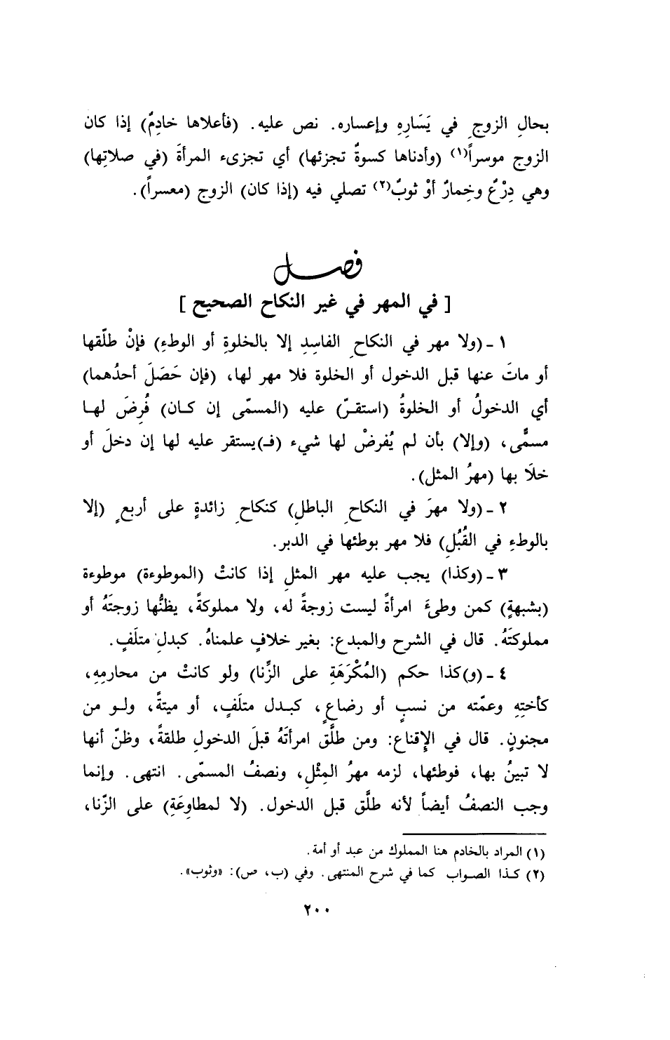 1 - (ولا مهر في النكاحِ الفاسِدِ إلا بالخلوةِ أو الوطء) فإنْ طلّقها أو ماتَ عنها قبل الدخول أو الخلوة فلا مهر لها، (فإن حَصَلَ أحدُهما) أي الدخولُ أو الخلوةُ (استقرّ) عليه (المسمى إن كان) فُرِضَ لها مسمًّى، (وإلا) بأن لم يُفرضْ لها شيء (فـ) يستقر عليه لها إن دخلَ أو خلَا بها (مهرُ المثل).