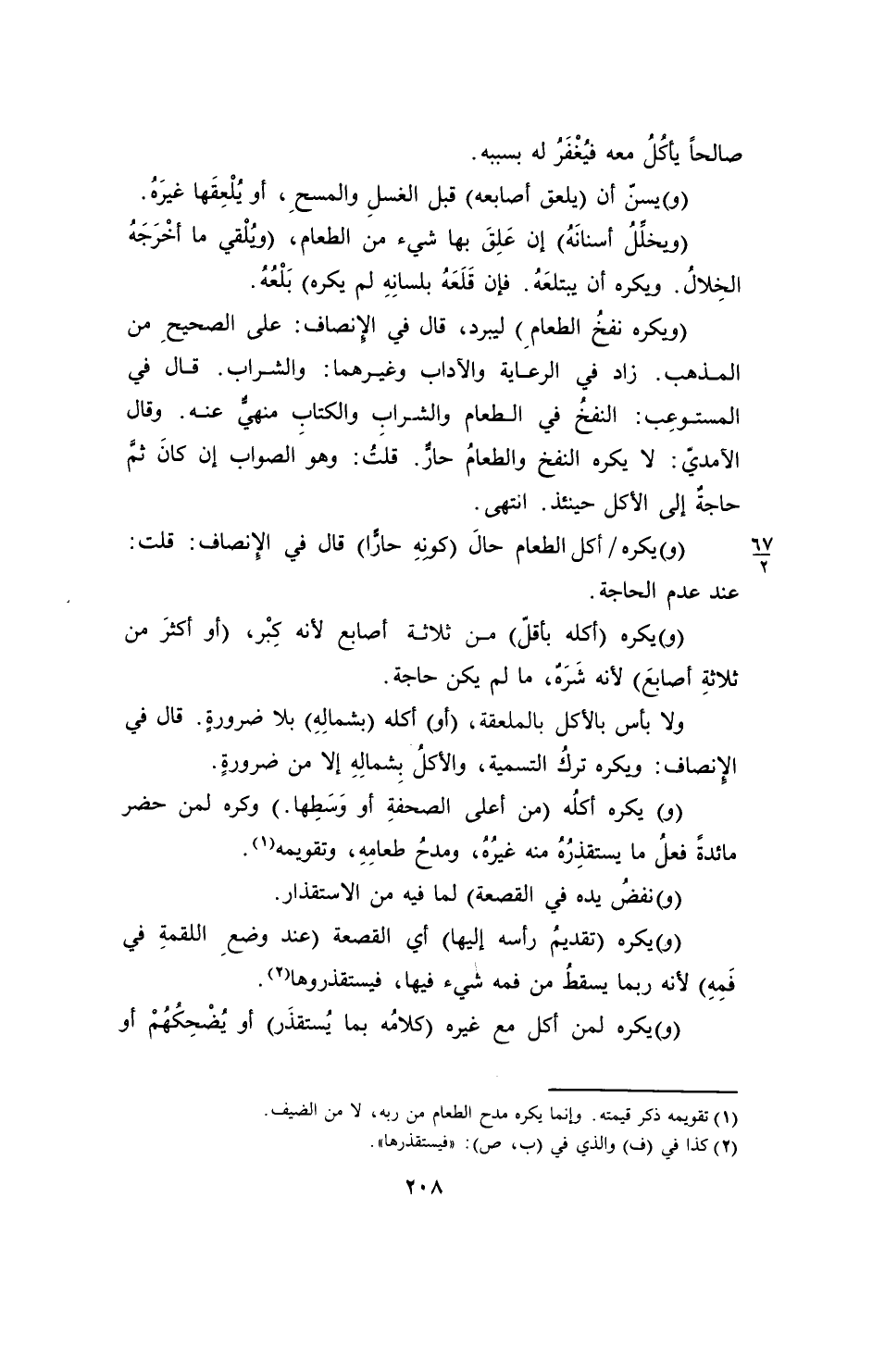 (ويكره نفخُ الطعام) ليبرد، قال في الإنصاف: على الصحيحِ من المذهب. زاد في الرعَاية والآداب وغيرهما: والشراب. قال في المستوعِب: النفخُ في الطعام والشراب والكتاب منهيٌّ عنه. وقال الأمديّ: لا يكره النفخ والطعامُ حارٌّ. قلَتُ: وهوَ الصواب إن كانَ ثمَّ حاجةٌ إلى الأكل حينئذ. انتهى.