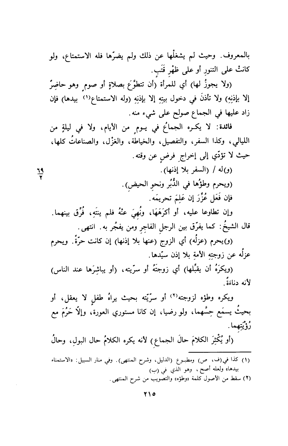 (¬1) كذا في (ف، ص) ومطبوع (الدليل، وشرح المنتهى). وفي منار السبيل: "الاستمناء بيدها" ولعله أصح، وهو الذي في (ب)