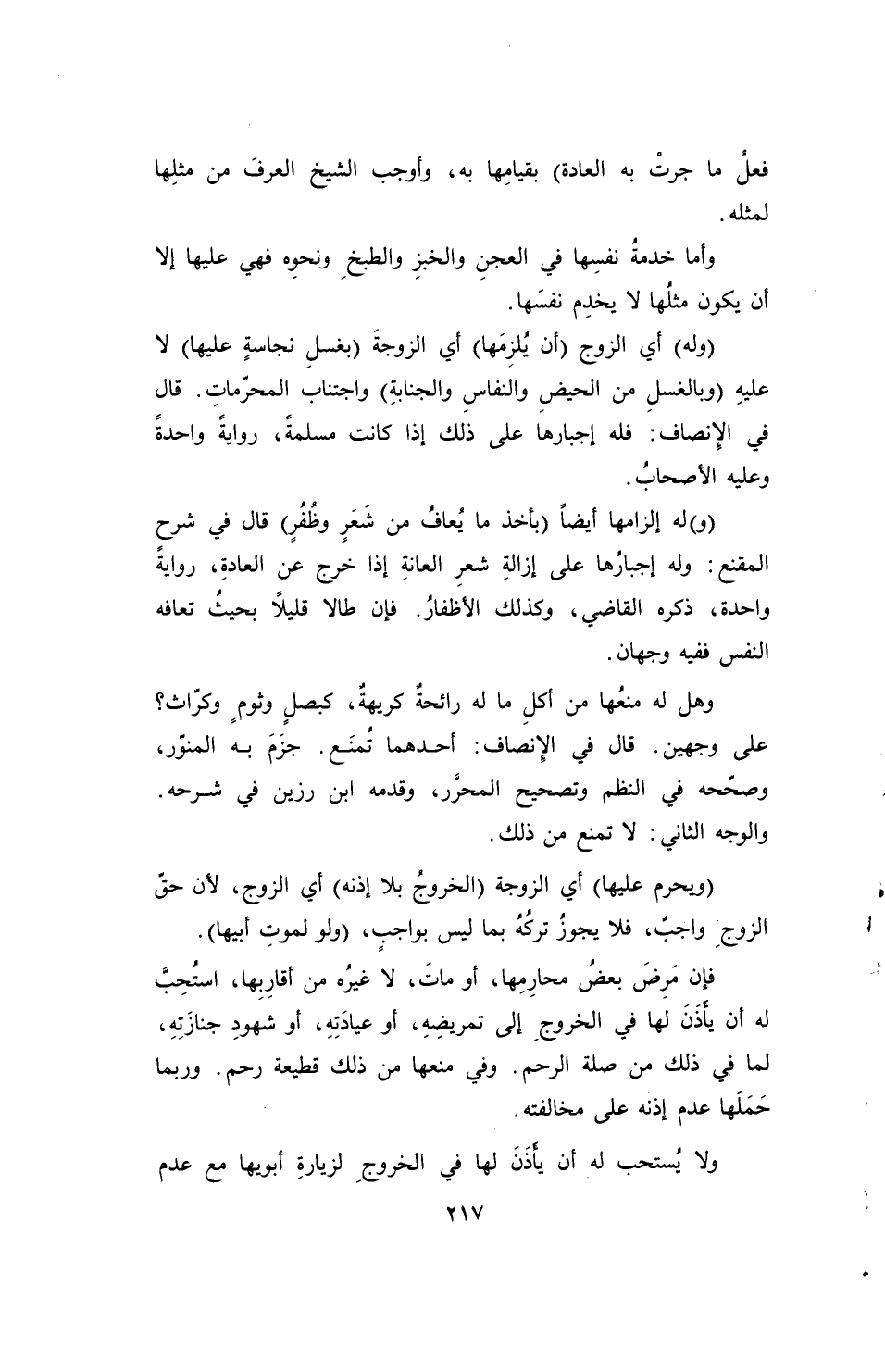 (وله) أي الزوج (أن يُلزِمَها) أي الزوجةَ (بغسلِ نجاسةٍ عليها) لا عليهِ (وبالغسلِ من الحيضِ والنفاسِ والجنابةِ) واجتناب المحرّماتِ. قال في الإِنصاف: فله إجبارها على ذلك إذا كانت مسلمةً، روايةً واحدةً وعليه الأصحابُ.
