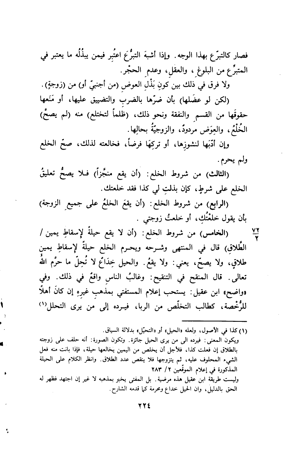 (الخامس) من شروط الخلع: (أن لا يقع حيلةً لإسقاطِ يمين الطَّلاقِ) قال في المنتهى وشرحه ويحرم الخلع حيلةً لإِسقاطِ يمين طلاقٍ، ولا يصحّ، يعني: ولا يقعُ. والحيل خِدَاعٌ لا تُحِلّ ما حرَّم اللهُ تعالى. قال المنقح في التنقيح: وغالبُ الناسِ واقعٌ في ذلك. وفي "واضح" ابن عقيل: يستحب إعلام المستفتي بمذهب غيرِهِ إن كانَ أهلاً للرُّخْصة، كطالب التخلّص من الربا، فيرده إلىَ من يرى التحلل (¬1)