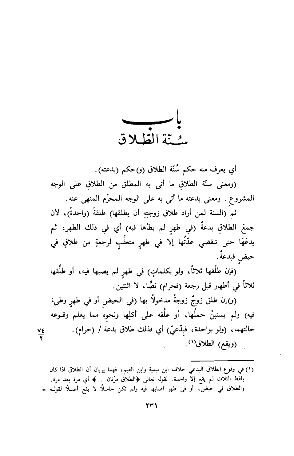 (¬1) في وقوع الطلاق البدعي خلاف ابن تيمية وابن القيم، فهما يريان أن الطلاق إذا كان بلفظ الثلاث لم يقع إلا واحدة. لقوله تعالى {الطلاق مرتان ... } أي مرة بعد مرة.