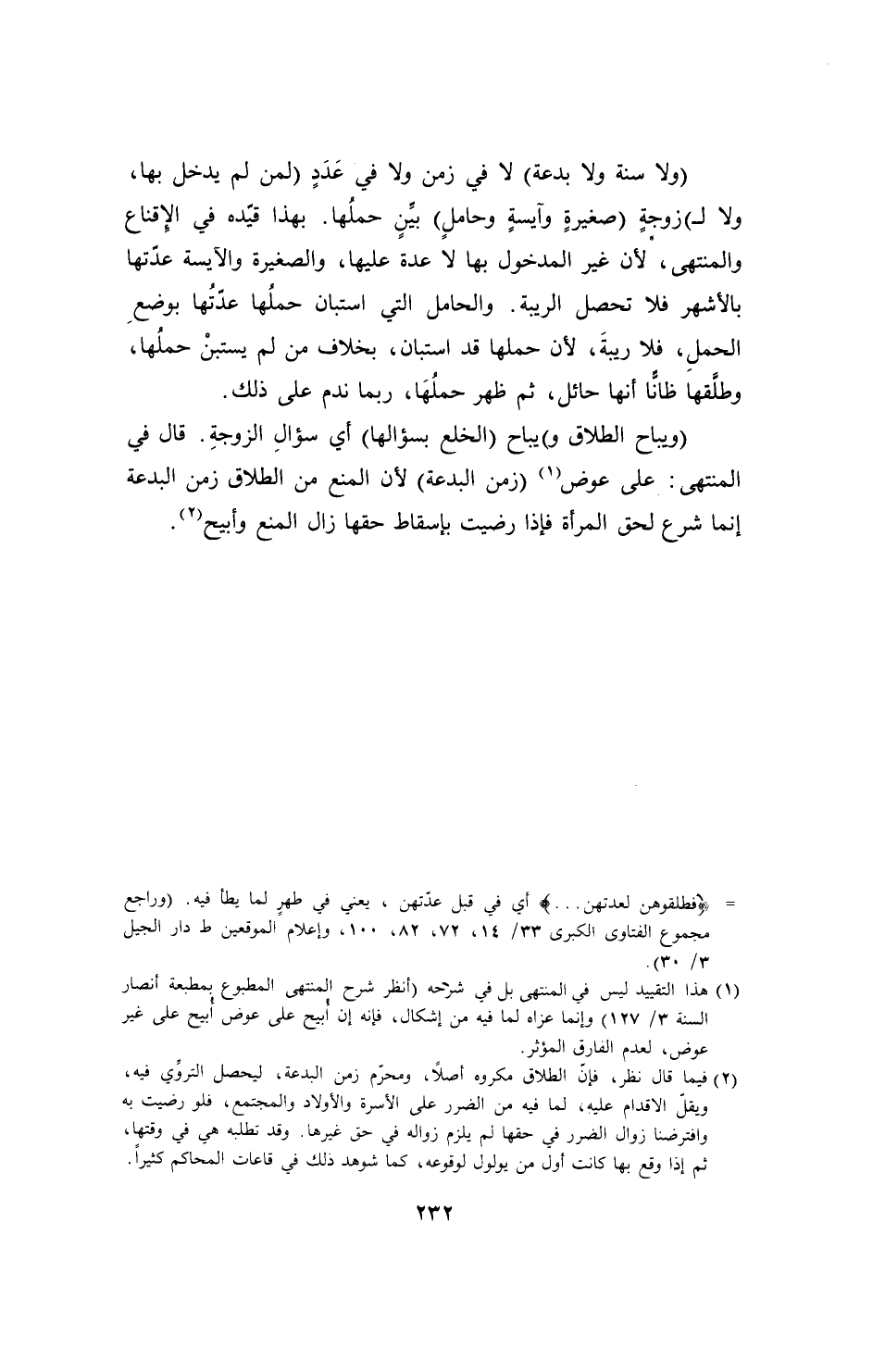 (¬2) فيما قال نظر، فإن الطلاق مكروه أصلاً، ومحرم زمن البدعة، ليحمل التروِّي فيه، ويقلّ الاقدام عليه، لما فيه من الضرر على الأسرة والأولاد والمجتمع، فلو رضيت به وافترضنا زوال الضرر في حقها لم يلزم زواله في حق غيرها. وقد تطلبه هي في وقتها، ثم إذا وقع بها كانت أول من يولول لوقوعه، كما شوهد ذلك في قاعات المحاكم كثيراً.