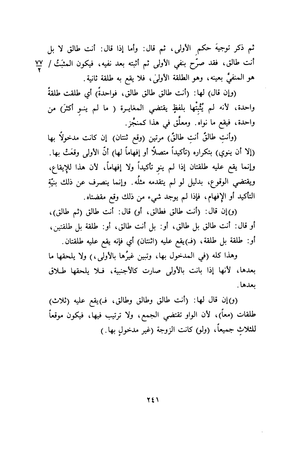 ثم ذكر توجيهَ حكمِ الأولى، ثم قال: وأما إذا قال: أنت طالق لا بل أنت طالق، فقد صرّح بنفي الأولى ثم أثبته بعد نفيه، فيكون المثبَتُ هو المنفيَّ بعينه، وهو الطلقة الأولى، فلا يقع به طلقة ثانية.