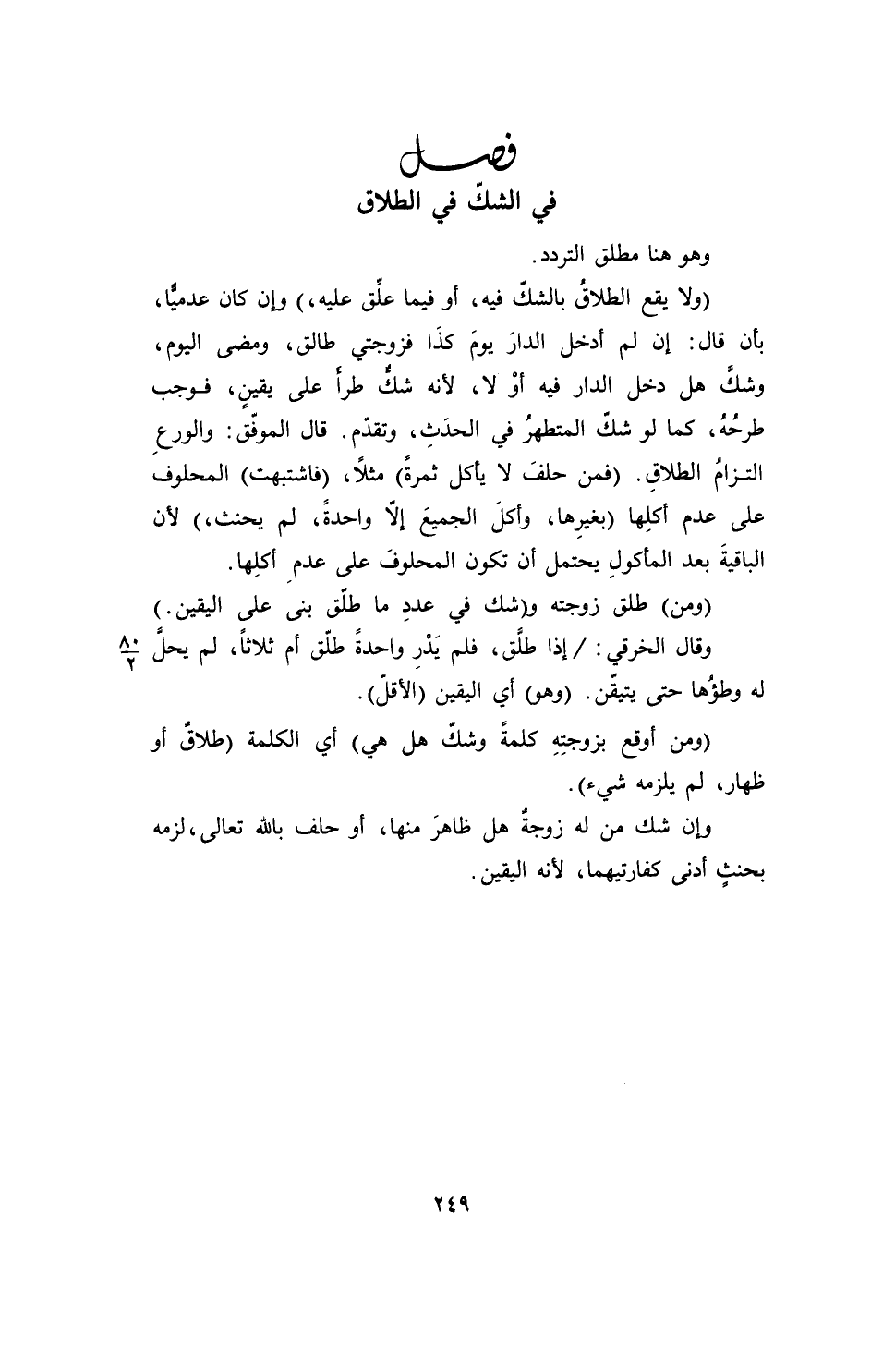 (ولا يقع الطلاقُ بالشكّ فيه، أو فيما علَّق عليه،) وإن كان عدمياً، بأن قال: إن لم أدخل الدارَ يومَ كذَا فزوجتي طالق، ومضى اليوم، وشكَّ هل دخل الدار فيه أوْ لا، لأنه شكٌّ طرأَ على يقينٍ، فوجب طرحُهُ، كما لو شكّ المتطهرُ في الحدَثِ، وتقدّم. قال الموفّق: والورعِ التزامُ الطلاقِ. (فمن حلفَ لا يأكل ثمرةً) مثلاً، (فاشتبهت) المحلوف على عدم أكلِها (بغيرِها، وأكلَ الجميعَ إلاَّ واحدةً، لم يحنث،) لأن الباقيةَ بعد المأكولِ يحتمل أن تكون المحلوفَ على عدمِ أكلِها.