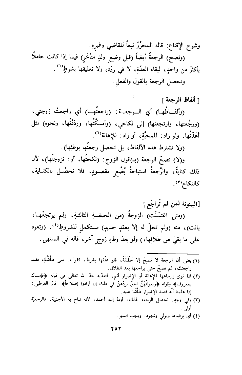 (وألفاظُها) أي الرجعة: (راجعتُها) أي راجعتُ زوجتي، (ورجعتها، وارتجعتها) إلى نكاحي، (وأمسكْتُها، ورددْتُها، ونحوه) مثل أعَدْتُها، ولو زاد: للمحبَّةِ، أو زاد: للإهانة (¬2).