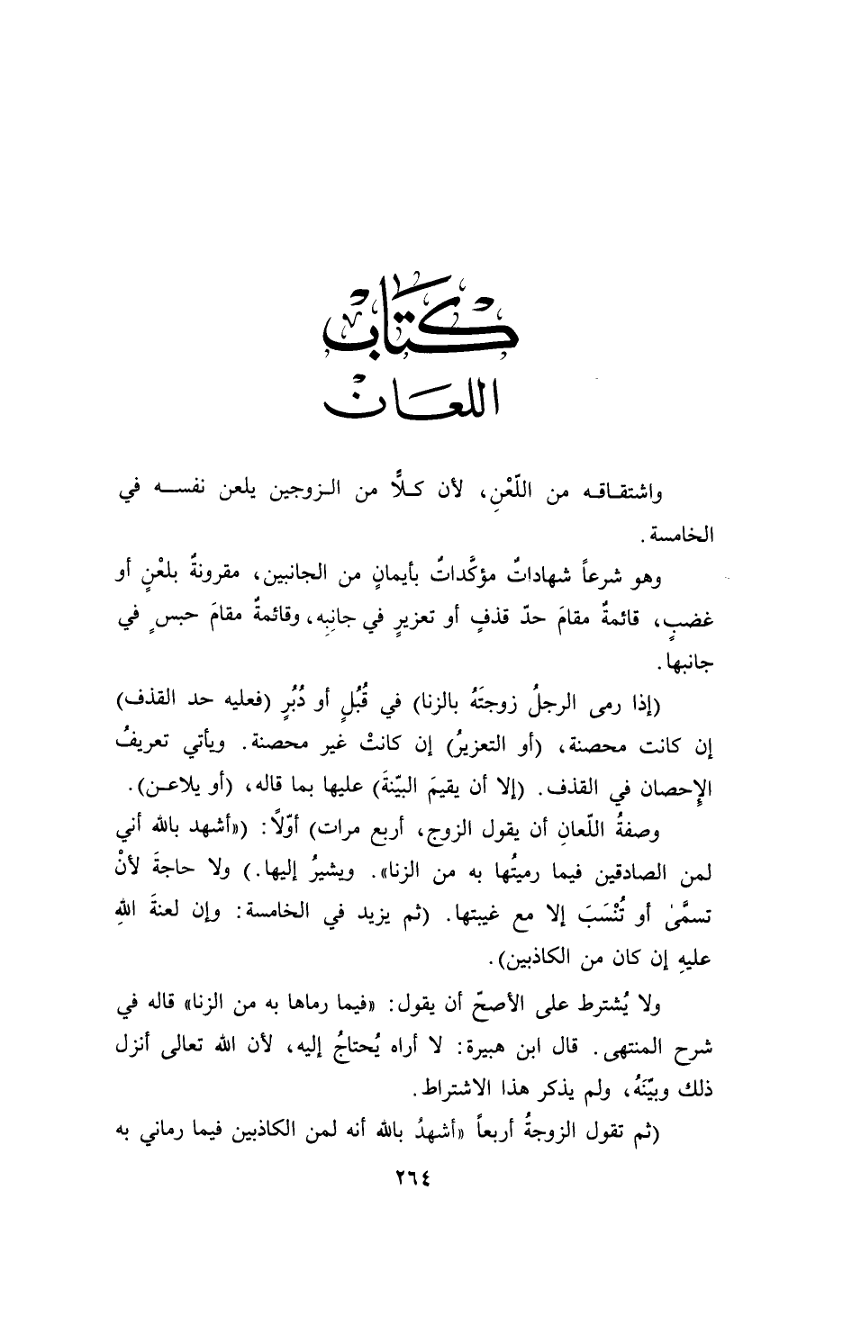 وصفةُ اللعانِ أن يقول الزوج، أربع مرات) أولاً: ("أشهد بالله أني لمن الصادقين فيما رميتُها به من الزنا". ويشيرُ إليها.) ولا حاجةَ لأنْ تسمَّى أو تُنْسَبَ إلا مع غيبتها. (ثم يزيد في الخامسة: وإن لعنةَ اللهِ عليهِ إن كان من الكاذبين).