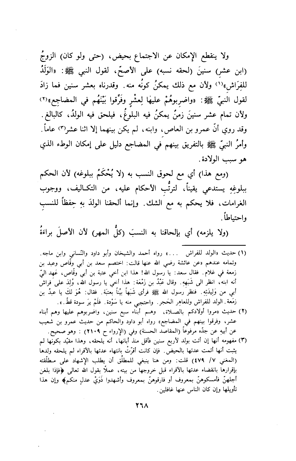 (¬1) حديث "الولد للفراش ... " رواه أحمد والشيخان وأبو داود والنَّسائي وابن ماجه. وتمامه عندهم "عن عائشة رضي الله عنها قالت: اختصم سعد بن أبي وقّاص وعبد بن زمعة في غلام. فقال سعد: يا رسول الله! هذا ابن أخي عتبة بن أبي وقّاص، عَهِد أليّ أنه ابنه، انظر إلى شَبَههِ. وقال عَبْدُ بن زَمْعَة: هذا أخي يا رسول الله، وُلِدَ علىَ فراش أبي من وَلِيدتِهِ. فنظرَ رسول الله - صلى الله عليه وسلم - فرأى شَبَهاً بيِّناً بعتبَة. فقال: هُوَ لكَ يا عبدُ بن زمَعة. الولد للفراش وللعاهر الحَجر. واحتجبي منه يا سَوْدة. فلَمْ يرَ سودة قطّ.".