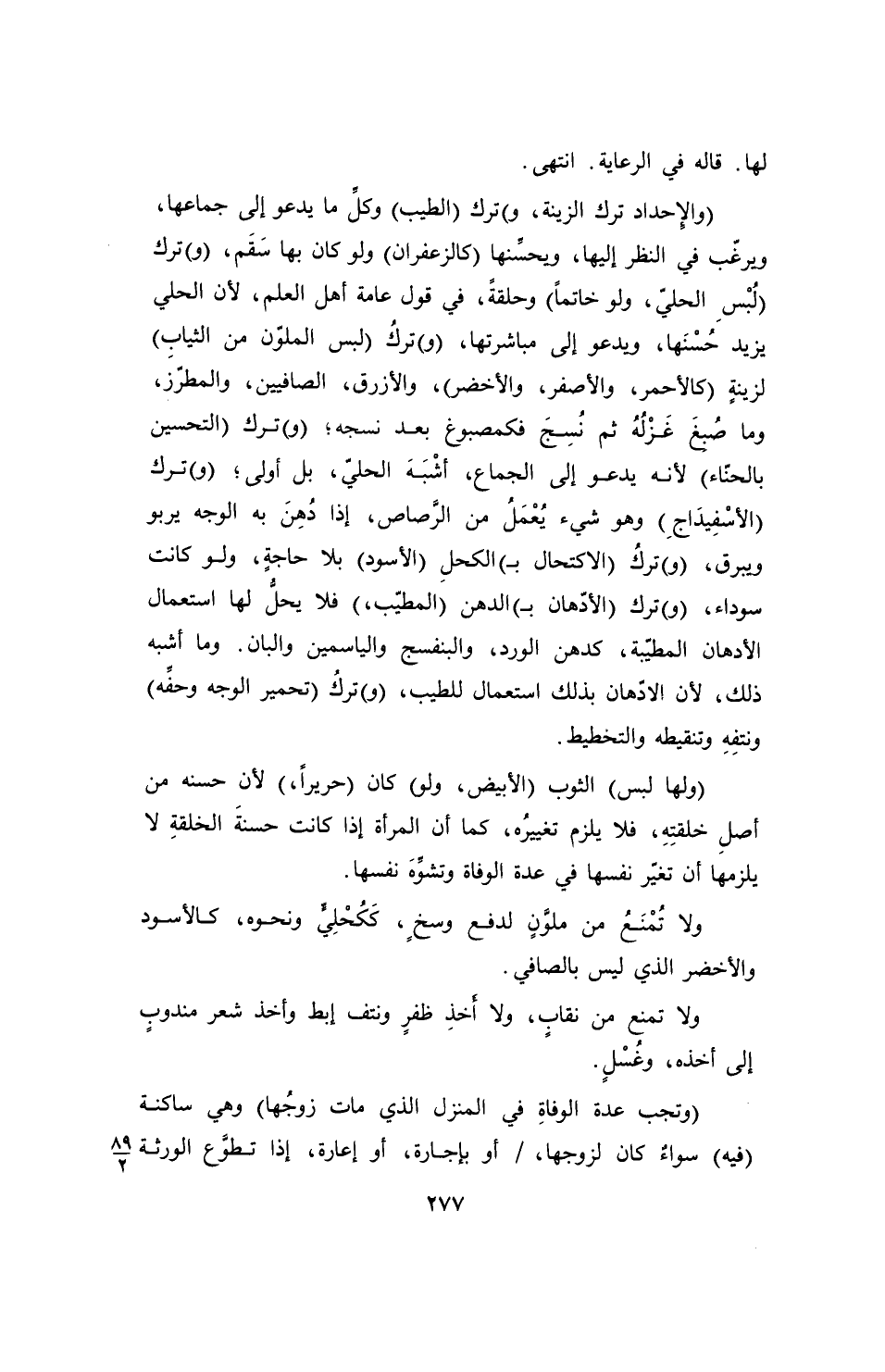 (والإحداد ترك الزينة، و) ترك (الطيب) وكلِّ ما يدعو إلى جماعها، ويرغّب في النظر إليها، ويحسِّنها (كالزعفران) ولو كان بها سَقَم، (و) ترك (لُبْسِ الحليّ، ولو خاتماً) وحلقةً، في قول عامة أهل العلم، لأن الحلي يزيد حُسْنَها، ويدعو إلى مباشرتها، (و) تركُ (لبس الملوّن من الثياب) لزينةٍ (كالأحمر، والأصفر، والأخضر)، والأزرق، الصافيين، والمطرّزَ، وما صُبغَ غَزْلُهُ ثم نُسِجَ فكمصبوغ بعد نسجه؛ (و) ترك (التحسين بالحنّاء) لأنه يدعو إلى الجماع، أشْبَهَ الحليّ، بل أولى؛ (و) ترك (الأسْفِيدَاجِ) وهو شيء يُعْمَلُ من الرَّصاص، إذا دُهِنَ به الوجه يربو ويبرق، (و) تركُ (الاكتحال بـ) الكحلِ (الأسود) بلا حاجةٍ، ولو كانت سوداء، (و) ترك (الأدّهان بـ) الدهن (المطيّب،) فلا يحلُّ لها استعمال الأدهان المطيّبة، كدهن الورد، والبنفسج والياسمين والبان. وما أشبه ذلك، لأن الادّهان بذلك استعمال للطيب، (و) تركُ (تحمير الوجه وحفِّه) ونتفِهِ وتنقيطه والتخطيط.