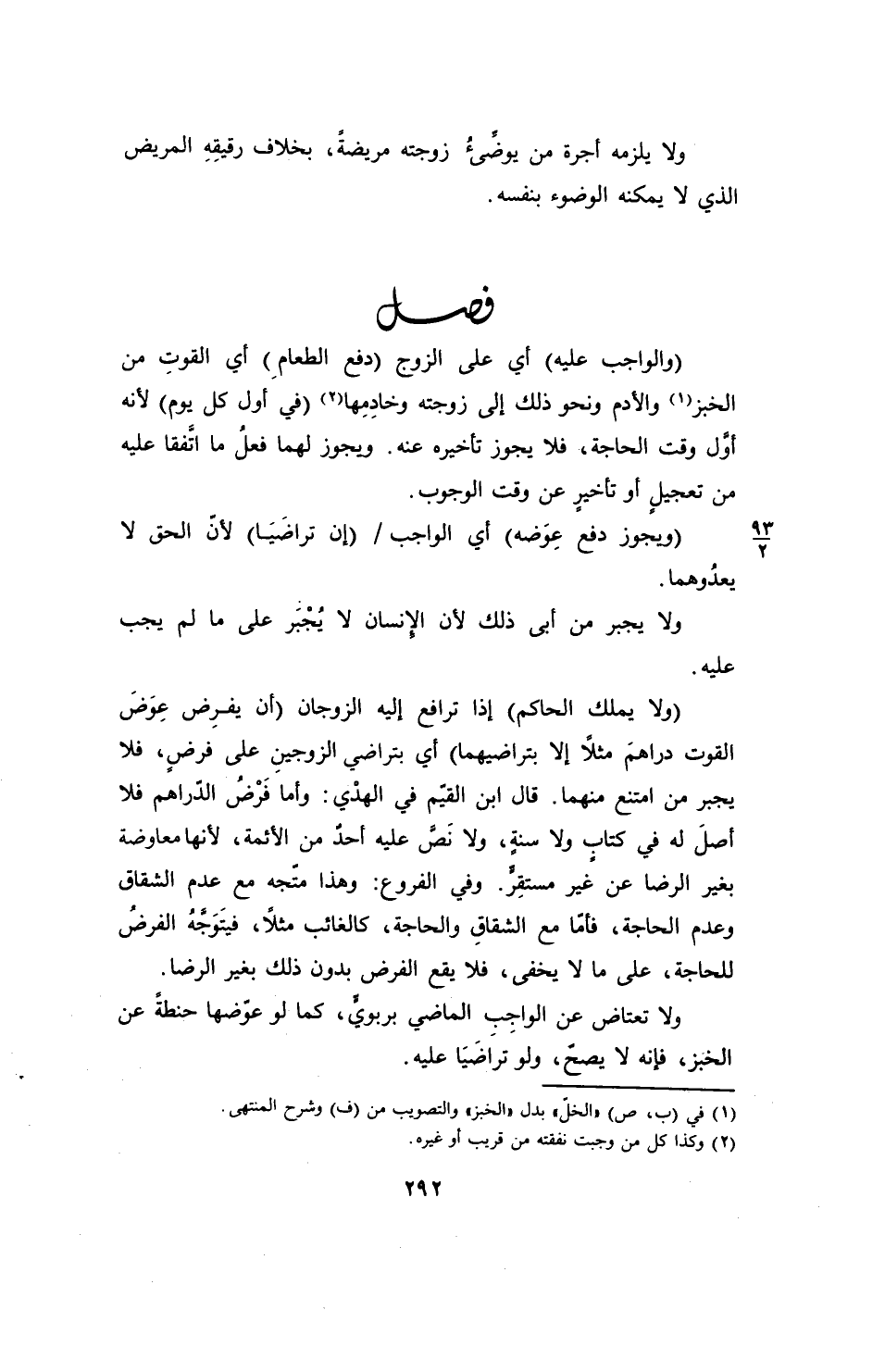 ولا يلزمه أجرة من يوضِّئُ زوجته مريضةً، بخلاف رقيقِهِ المريض الذي لا يمكنه الوضوء بنفسه.
