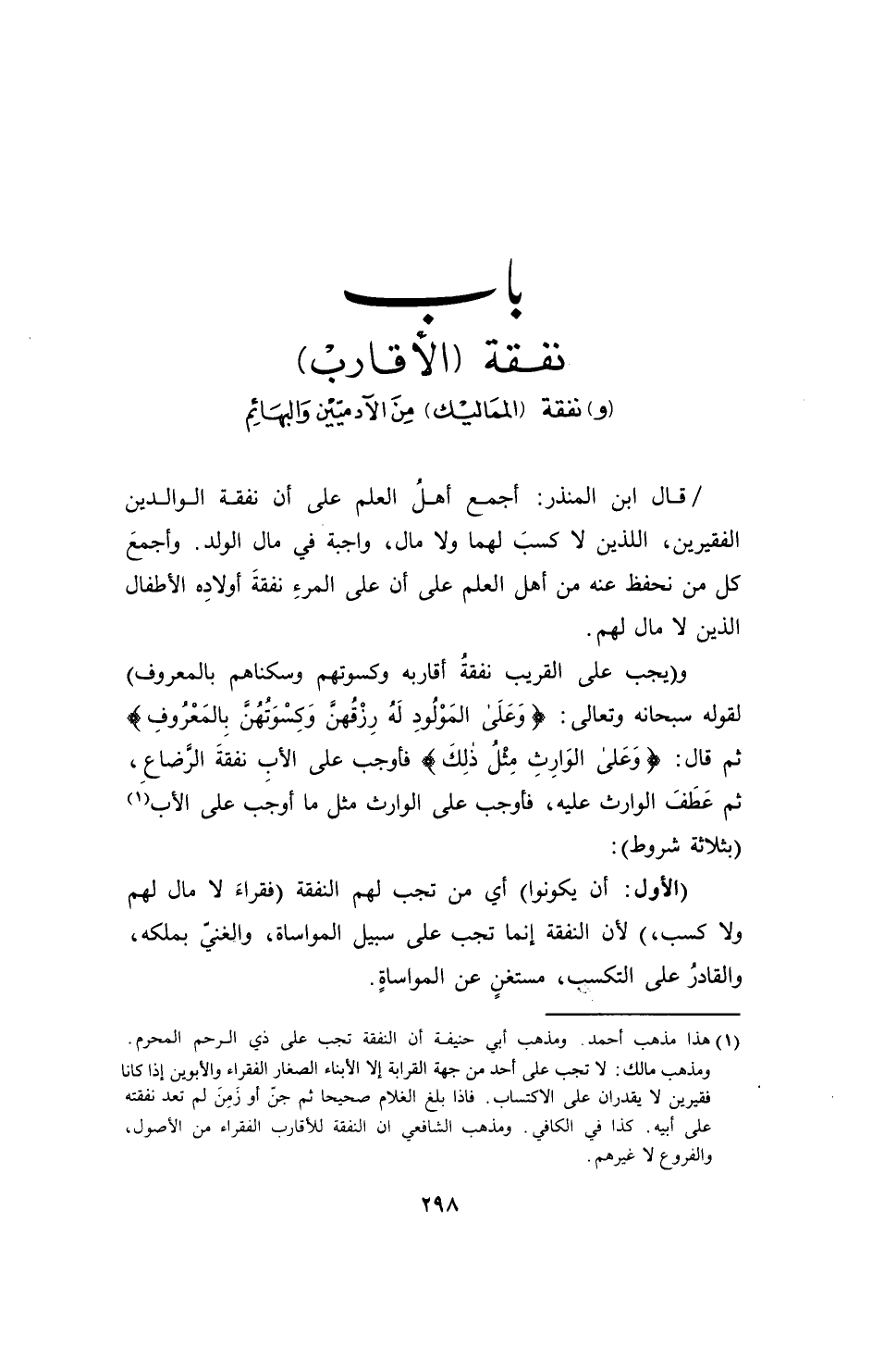(¬1) هذا مذهب أحمد. ومذهب أبي حنيفة أن النفقة تجب على ذي الرحم المحرم. ومذهب مالك: لا تجب على أحد من جهة القرابة إلا الأبناء الصغار الفقراء والأبوين إذا كانا فقيرين لا يقدران على الاكتساب. فإذا بلغ الغلام صحيحاً ثم جنّ أو زَمِنَ لم تعد نفقته على أبيه. كذا في الكافي. ومذهب الشافعي أن النفقة للأقارب الفقراء من الأصول، والفروع لا غيرهم.