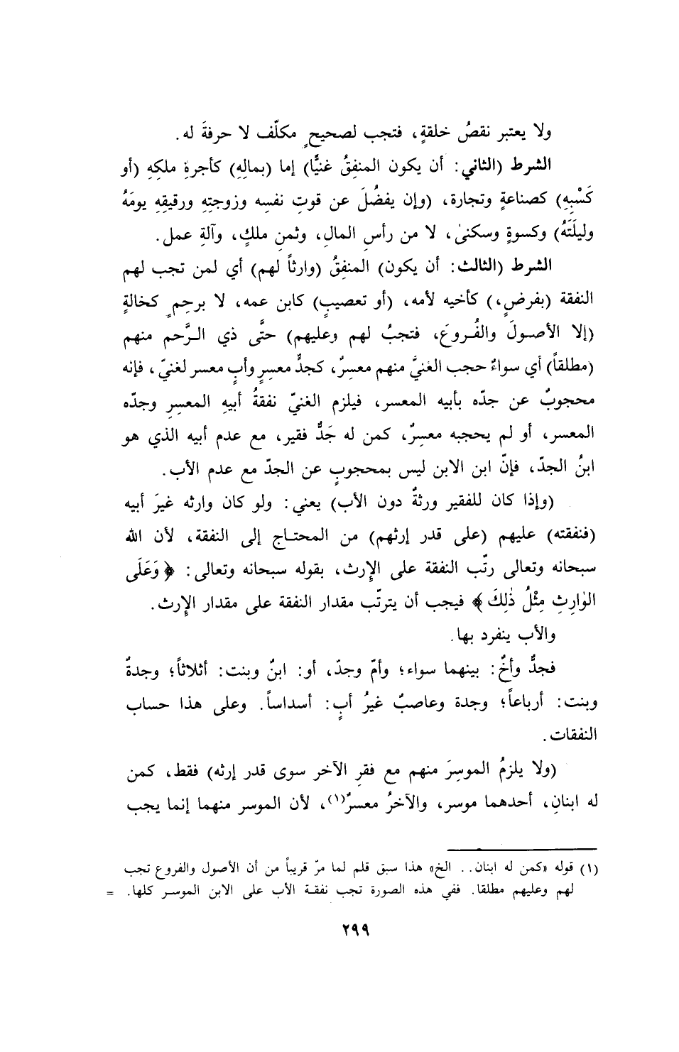 الشرط (الثالث: أن يكون) المنفِقُ (وارثاً لهم) أي لمن تجب لهم النفقة (بفرضٍ،) كأخيه لأمه، (أو تعصيبٍ) كابن عمه، لا برحِمٍ كخالةٍ (إلا الأصولَ والفُروعَ، فتجبُ لهم وعليهم) حتَّى ذي الرَّحم منهم (مطلقاً) أي سواءٌ حجب الغنيَّ منهم معسِرٌ، كجدٍّ معسِرٍ وأبٍ معسر لغنيّ، فإنه محجوبٌ عن جدّه بأبيه المعسر، فيلزم الغنيّ نفقةُ أبَيهِ المعسِرِ وجدّه المعسر، أو لم يحجبه معسِرٌ، كمن له جَدٌّ فقير، مع عدم أبيه الذي هو ابنُ الجدّ، فإنّ ابن الابن ليس بمحجوبٍ عن الجدّ مع عدم الأب.