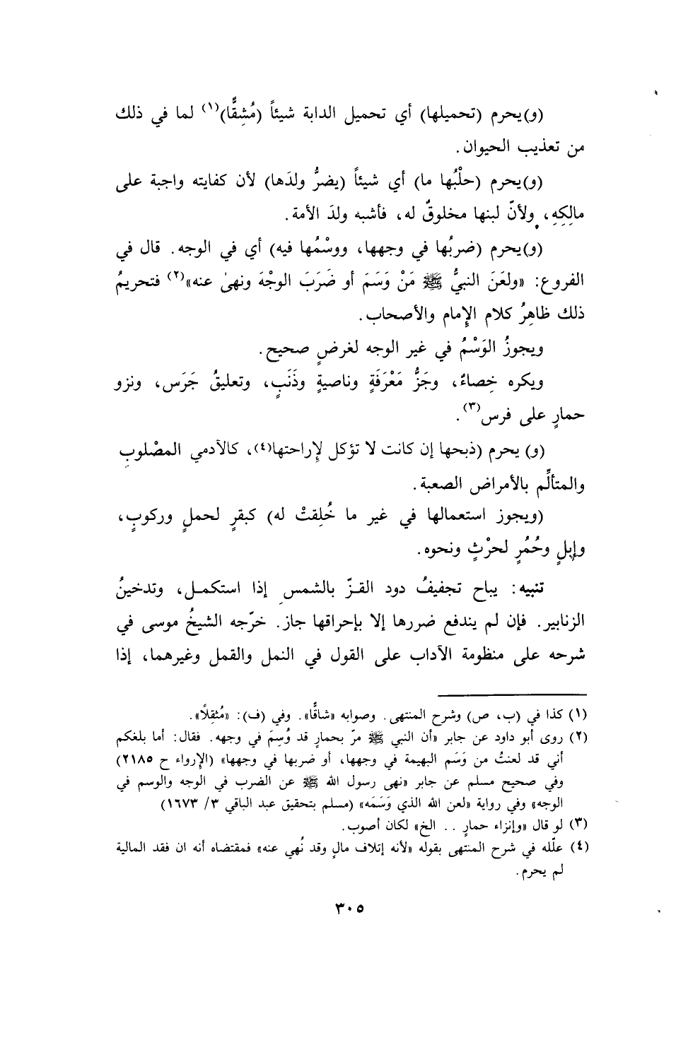 (¬2) روى أبو داود عن جابر "إن النبي - صلى الله عليه وسلم - مرَّ بحمارٍ قد وُسِمَ في وجهه. فقال: أما بلغكم أني قد لعنتُ من وَسَم البهيمة في وجهها، أو ضربها في وجهها" (الإِرواء ح 2185) وفي صحيح مسلم عن جابر "نهى رسول الله - صلى الله عليه وسلم - عن الضرب في الوجه والوسم في الوجه" وفي رواية "لعن الله الذي وَسَمَه" (مسلم بتحقيق عبد الباقي 3/ 1673)