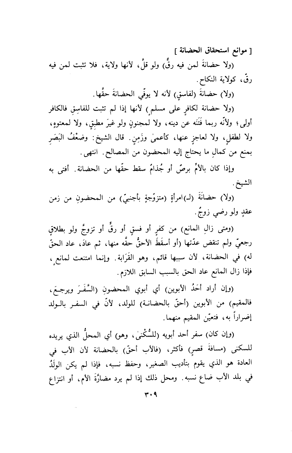 (ولا حضانة لكافرٍ على مسلمٍ) لأنها إذا لم تثبت للفاسِقِ فالكافر أولى؛ ولأنّه ربما فَتَنَه عن دينه، ولا لمجنونٍ ولو غيرَ مطبِقٍ، ولا لمعتوهٍ، ولا لطفلٍ، ولا لعاجزٍ عنها، كأعمى وزَمِنٍ. قال الشيخ: وضعْفُ البَصَرِ بمنع من كمالِ ما يحتاج إليه المحضون من المصالح. انتهى.