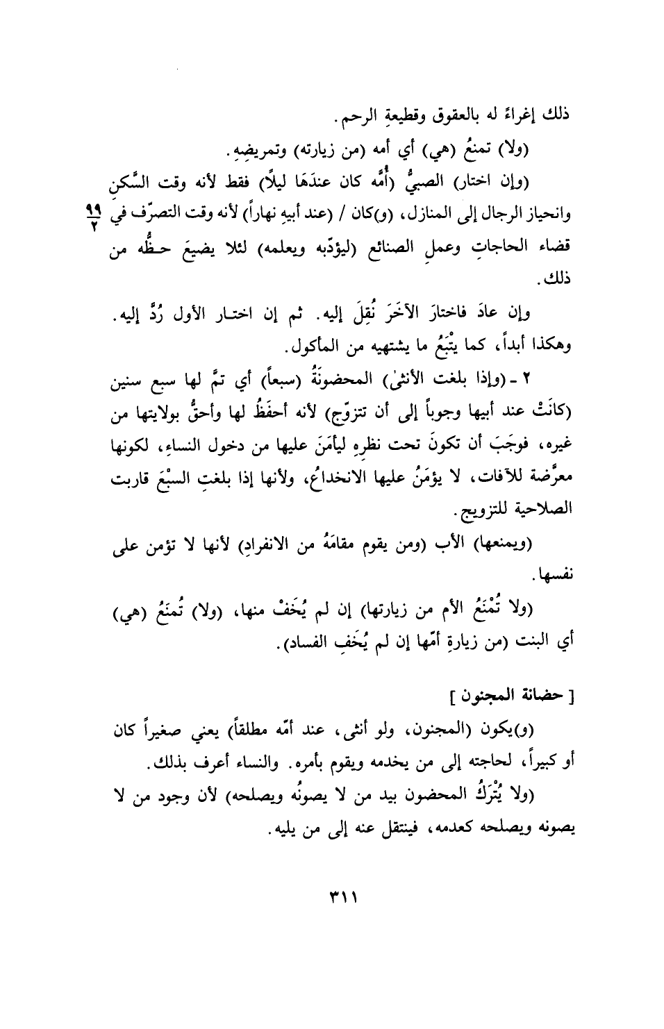 2 - (وإذا بلغت الأنثى) المحضونَةُ (سبعاً) أي تمَّ لها سبع سنين (كانَتْ عند أبيها وجوباً إلى أن تتزوّج) لأنه أحفَظُ لها وأحقُّ بولايتها من غيره، فوجَبَ أن تكونَ تحت نظرِهِ ليأمَنَ عليها من دخول النساءِ، لكونها معرَّضة للآفات، لا يؤمَنُ عليها الانخداعُ، ولأنها إذا بلغتِ السبْعَ قاربت الصلاحية للتزويج.