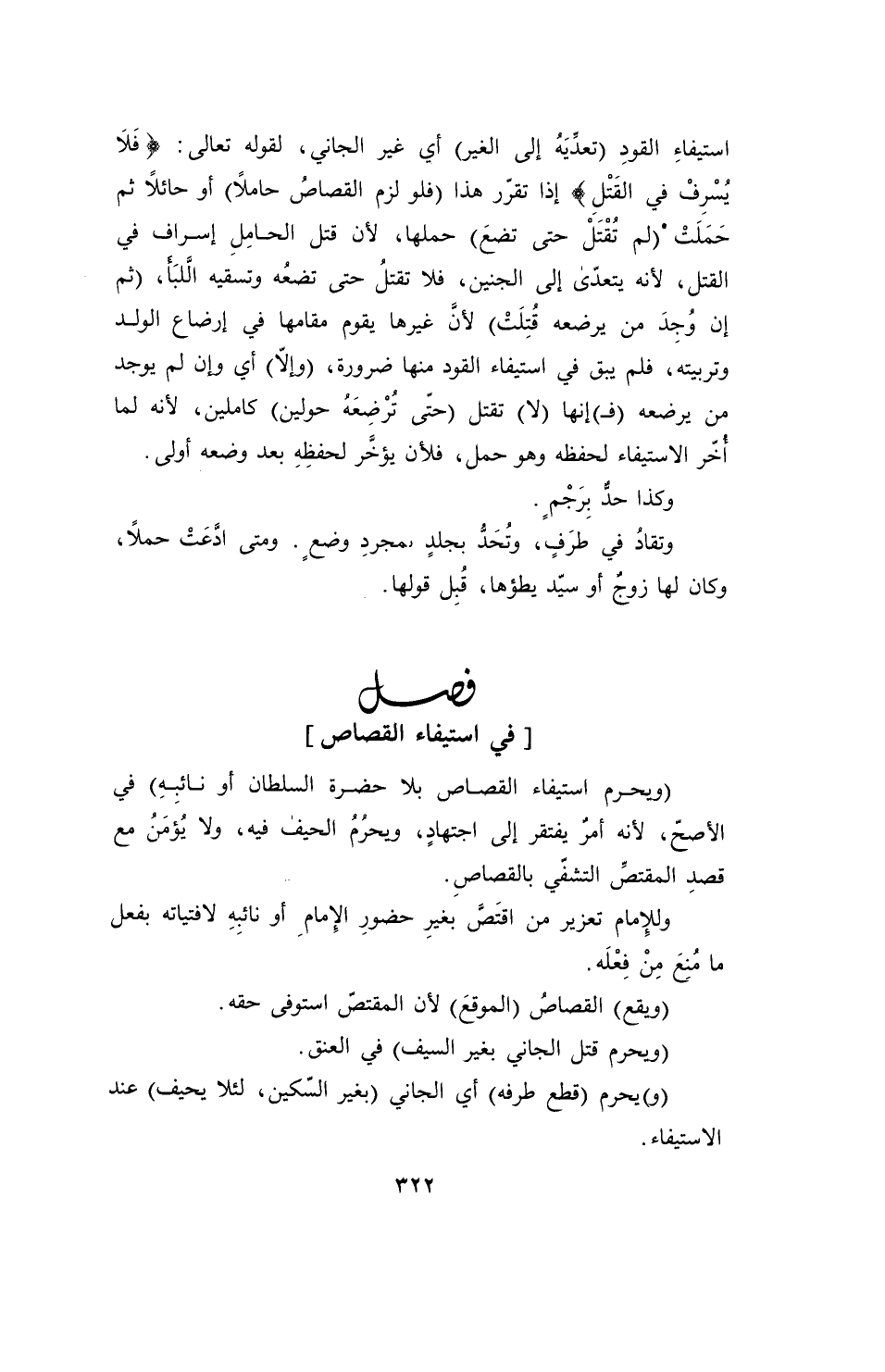 استيفاءِ القودِ (تعدِّيَهُ إلى الغير) أي غير الجاني، لقوله تعالى: {فَلَا يُسْرِفْ فِي الْقَتْلِ} إذا تقرّر هذا (فلو لزم القصاصُ حاملاً) أو حائلاً ثم حَمَلَتْ (لم تُقْتَلْ حتى تضعَ) حملها، لأن قتل الحامِلِ إسراف في القتل، لأنه يتعدّى إلى الجنين، فلا تقتلُ حتى تضعُه وتسقيه الَّلبَأَ، (ثم إن وُجِدَ من يرضعه قُتِلَتْ) لأنَّ غيرها يقوم مقامها في إرضاع الولد وتربيته، فلم يبق في استيفاء القود منها ضرورة، (وإلاَّ) أي وإن لم يوجد من يرضعه (فـ) إنها (لا) تقتل (حتّى تُرْضِعَهُ حولين) كاملين، لأنه لما أُخّر الاستيفاء لحفظه وهو حمل، فلأن يؤخَّر لحفظِهِ بعد وضعه أولى.