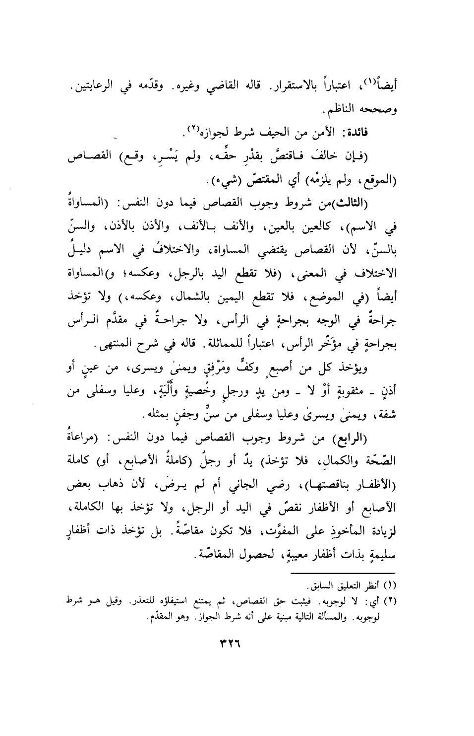 (الثالث) من شروط وجوب القصاص فيما دون النفس: (المساواةُ في الاسم)، كالعين بالعين، والأنف بالأنف، والأذن بالأذن، والسنّ بالسنّ، لأن القصاص يقتضي المساواة، والاختلافُ في الاسم دليلٌ الاختلاف في المعنى، (فلا تقطع اليد بالرجل، وعكسه، و) المساواة أيضاً (في الموضع، فلا تقطع اليمين بالشمال، وعكسه،) ولا تؤخذ جراحةٌ في الوجه بجراحةٍ في الرأس، ولا جراحةٌ في مقدَّم الرأس بجراحةٍ في مؤَخّر الرأس، اعتباراً للمماثلة. قاله في شرح المنتهى.