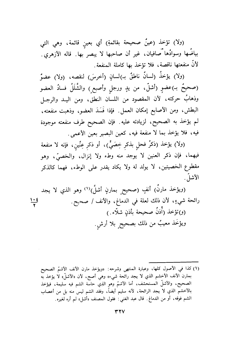 (¬1) كذا في الأصول كلها، وعبارة المنتهى وشرحه: "ويؤخذ مارن الأنف الأشمّ الصحيح بمارن الأنف الأخشم الذي لا يجد رائحة شيء" وهي أصح، لأن "الأشلّ" لا يؤخذ به الصحيح، والأشلّ المستحشف، أما الأشمّ وهو الذي حاسة الشم فيه سليمة، فيؤخذ بالأخشم الذي لا يجد الرائحة، لأنه سليم أيضاً، وفقد الشم ليس منه بل من أعصاب الشم فوقه، أو من الدماغ. قال عبد الغني: فقول المصنف "أشل" لم أره لغيره.