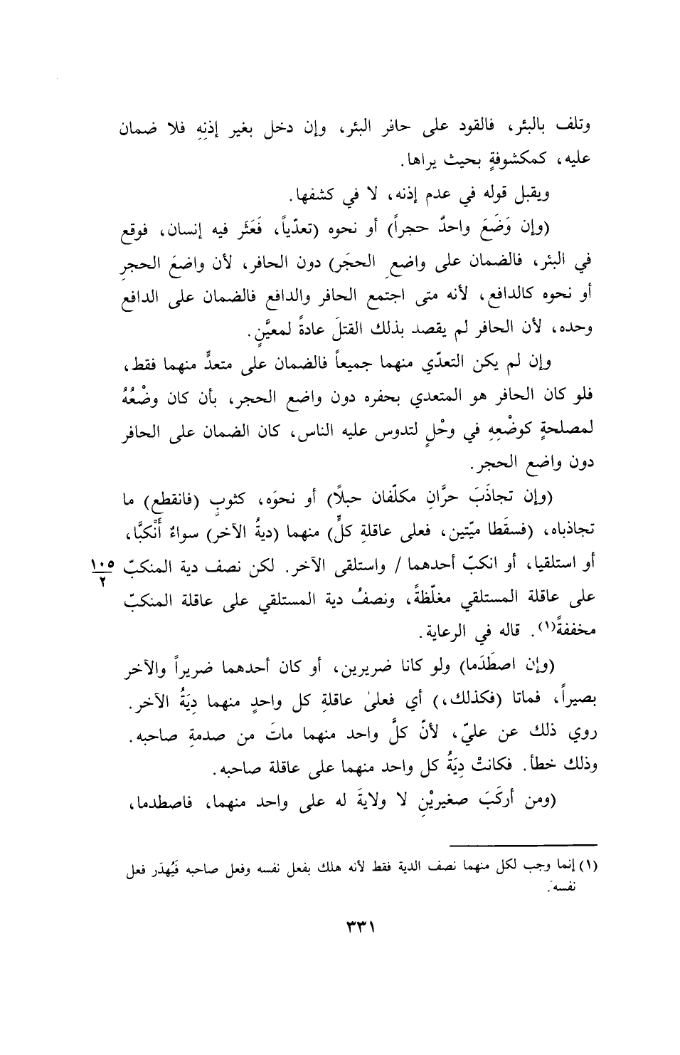 وإن لم يكن التعدّي منهما جميعاً فالضمان على متعدٍّ منهما فقط، فلو كان الحافر هو المتعدي بحفره دون واضع الحجر، بأن كان وضْعُهُ لمصلحةٍ كوضْعِهِ في وحْلٍ لتدوس عليه الناس، كان الضمان على الحافر دون واضع الحجر.