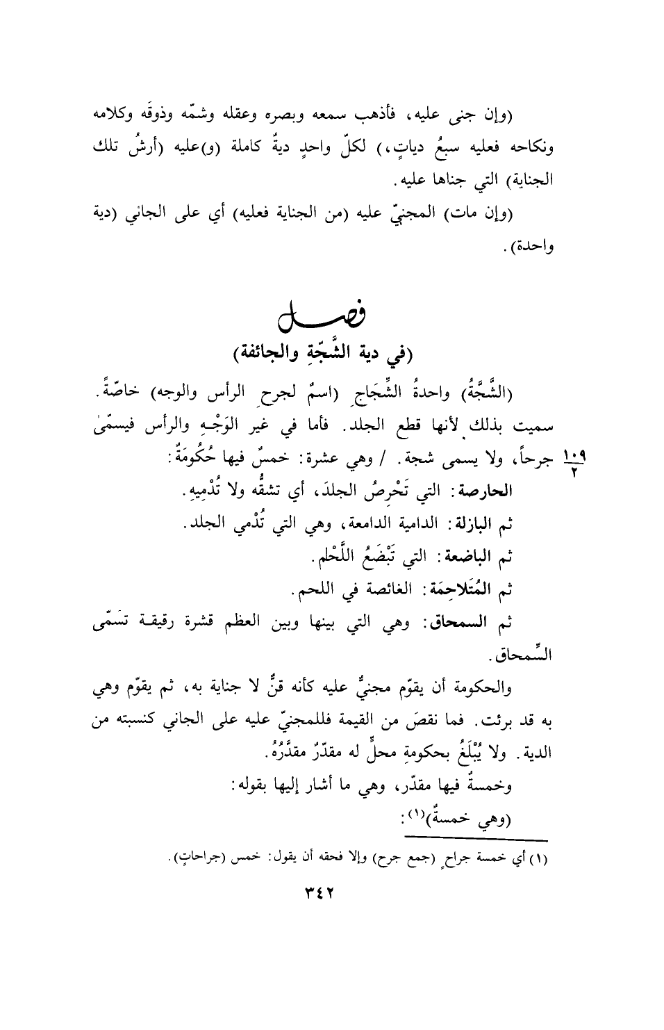 (الشَّجَّةُ) واحدةُ الشَّجَاجِ (اسمٌ لجرحِ الرأس والوجه) خاصّةً. سميت بذلك لأنها قطع الجلد. فأما في غير الوَجْهِ والرأس فيسمّى جرحاً، ولا يسمى شجة. وهي عشرة: خمسٌ فيها حُكُومَةٌ: