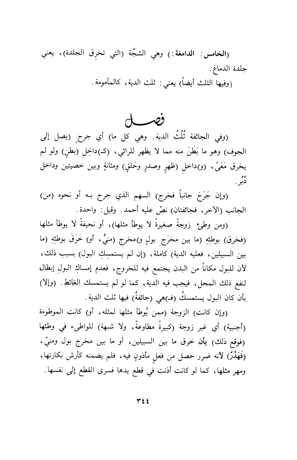 (وفي الجائفة ثُلُثُ الدية. وهي كل ما) أي جرحٍ (يصل إلى الجوف) وهو ما بَطَنَ منه مما لا يظهر للرائي، (كـ) داخِلِ (بطنٍ) ولو لم يخرق مَعًى، (و) داخلِ (ظهرٍ وصدرٍ وحَلقٍ) ومثانةٍ وبين خصيتين وداخل دُبُر.