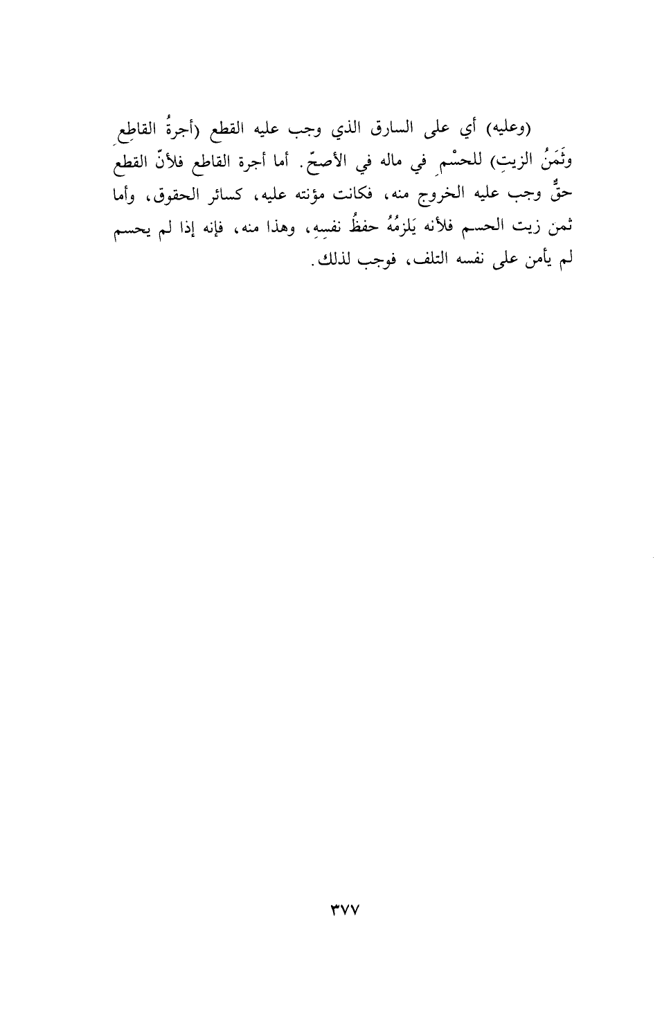 (وعليه) أي على السارق الذي وجب عليه القطع (أجرةُ القاطِع وثَمَنُ الزيتِ) للحسْمِ في ماله في الأصحّ. أما أجرة القاطع فلأنّ القطع حقٌّ وجب عليه الخروج منه، فكانت مؤنته عليه، كسائر الحقوق، وأما ثمن زيت الحسم فلأنه يَلزمُهُ حفظُ نفسِهِ، وهذا منه، فإنه إذا لم يحسم لم يأمن على نفسه التلف، فوجب لذلك.