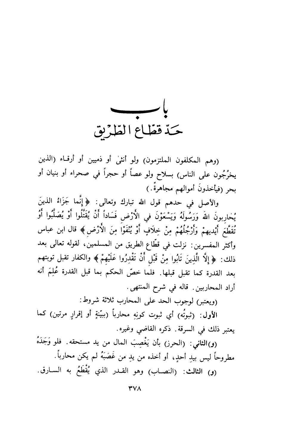 (وهم المكلفون الملتزمون) ولو أنثى أو ذميين أو أرقاء (الذين يخرُجُون على الناس) بسلاح ولو عصاً أو حجراً في صحراء أو بنيان أو بحر (فيأخذونَ أموالهم مجاهرةً.)