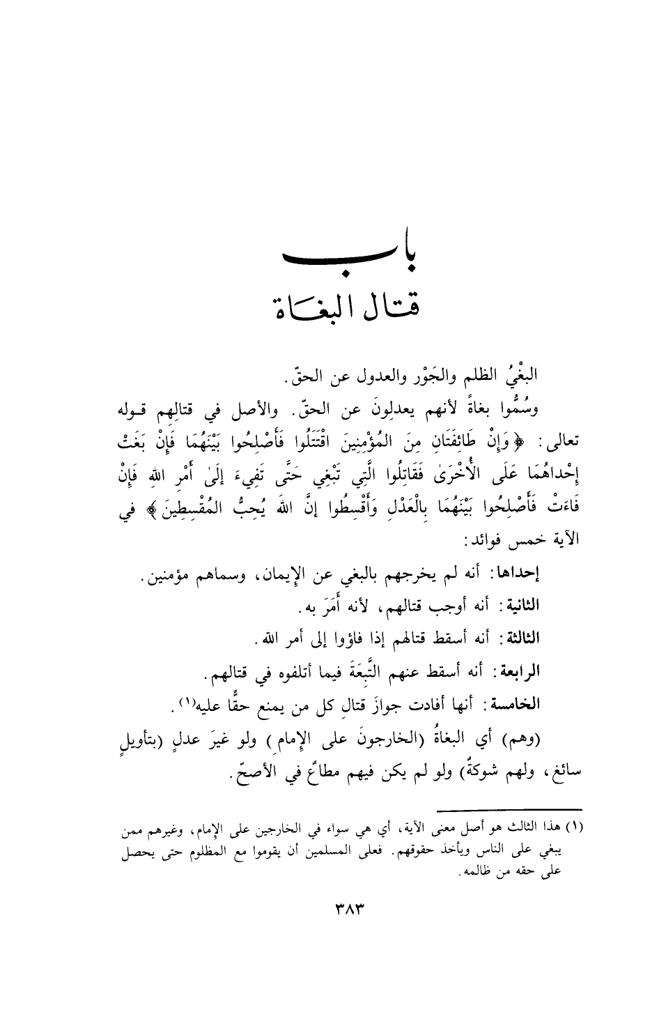 وسُمُّوا بغاةً لأنهم يعدلِونَ عن الحقّ. والأصل في قتالِهِم قوله تعالى: {وَإِنْ طَائِفَتَانِ مِنَ الْمُؤْمِنِينَ اقْتَتَلُوا فَأَصْلِحُوا بَيْنَهُمَا فَإِنْ بَغَتْ إِحْدَاهُمَا عَلَى الْأُخْرَى فَقَاتِلُوا الَّتِي تَبْغِي حَتَّى تَفِيءَ إِلَى أَمْرِ اللَّهِ فَإِنْ فَاءَتْ فَأَصْلِحُوا بَيْنَهُمَا بِالْعَدْلِ وَأَقْسِطُوا إِنَّ اللَّهَ يُحِبُّ الْمُقْسِطِينَ} في الآية خمس فوائد: