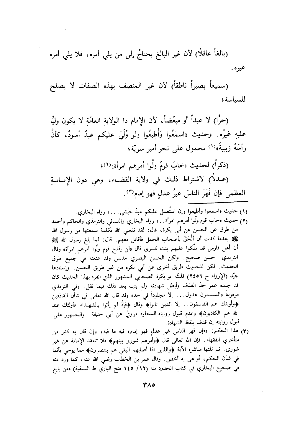 (¬2) حديث خاب قوم ولّوا أمرهم امرأة .. " رواه البخاري والنسائي والترمذي والحاكم وأحمد من طرق عن الحسن عن أبي بكرة، قال: لقد نفعني الله بكلمة سمعتها من رسول الله - صلى الله عليه وسلم - بعدما كدت أن ألْحَقَ بأصحاب الجمل فأقاتل معهم. قال؛ لما بلغ رسول الله - صلى الله عليه وسلم - أن أهل فارس قد ملّكوا عليهم بنت كسرى قال "لن يفلح قوم ولّوا أمرهم امرأة" وقال الترمذي: حسن صحيح. ولكن الحسن البصري مدلس وقد عنعنه في جميع طرق الحديث. لكن للحديث طريق أخرى عن أبي بكرة من غير طريق الحسن. وإسنادها جيّد (الإرواء ح 2456) قلتُ أبو بكرة الصحابي المشهور الذي انفرد بهذا الحديث كان قد جلده عمر حدّ القذف وأبطل شهادته ولم يتب بعد ذلك فيما نقل. وفي الترمذي مرفوعاً "المسلمون عدول ... إلا مجلوداً في حد" وقد قال الله تعالى في شأن القاذفين {وَأُولَئِكَ هُمُ الْفَاسِقُونَ * ... إِلاَّ الَّذِينَ تَابُوا} وقال {فَإِذْ لَمْ يَأْتُوا بِالشُّهَدَاءِ فَأُولَئِكَ عِنْدَ اللَّهِ هُمُ الْكَاذِبُونَ} وعدم قبول روايته المجلود مرويّ عن أبي حنيفة. والجمهور على قبول روايته إن قذف بلفظ الشهادة.