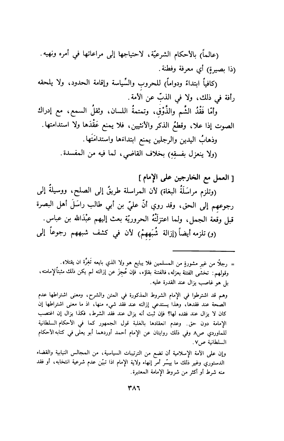 وهم قد اشترطوا في الإمام الشروط المذكورة في المتن والشرح، ومعنى اشتراطها عدم الصحة عند فقدها، وهذا يستدعي إزالته عند فقد شيء منها، إذ ما معنى اشتراطها إن كان لا يزال عند فقده لها؟ فإن ثبت أنه يزال عند فقد الشرط، فكذا يزال إن اغتصب الإمامة دون حق. وعدم انعقادها بالغلبة قول الجمهور كما في الأحكام السلطانية للماوردي ص 8 وفي ذلك روايتان عن الإِمام أحمد أوردهما أبو يعلى في كتابه الأحكام السلطانية ص 7.
