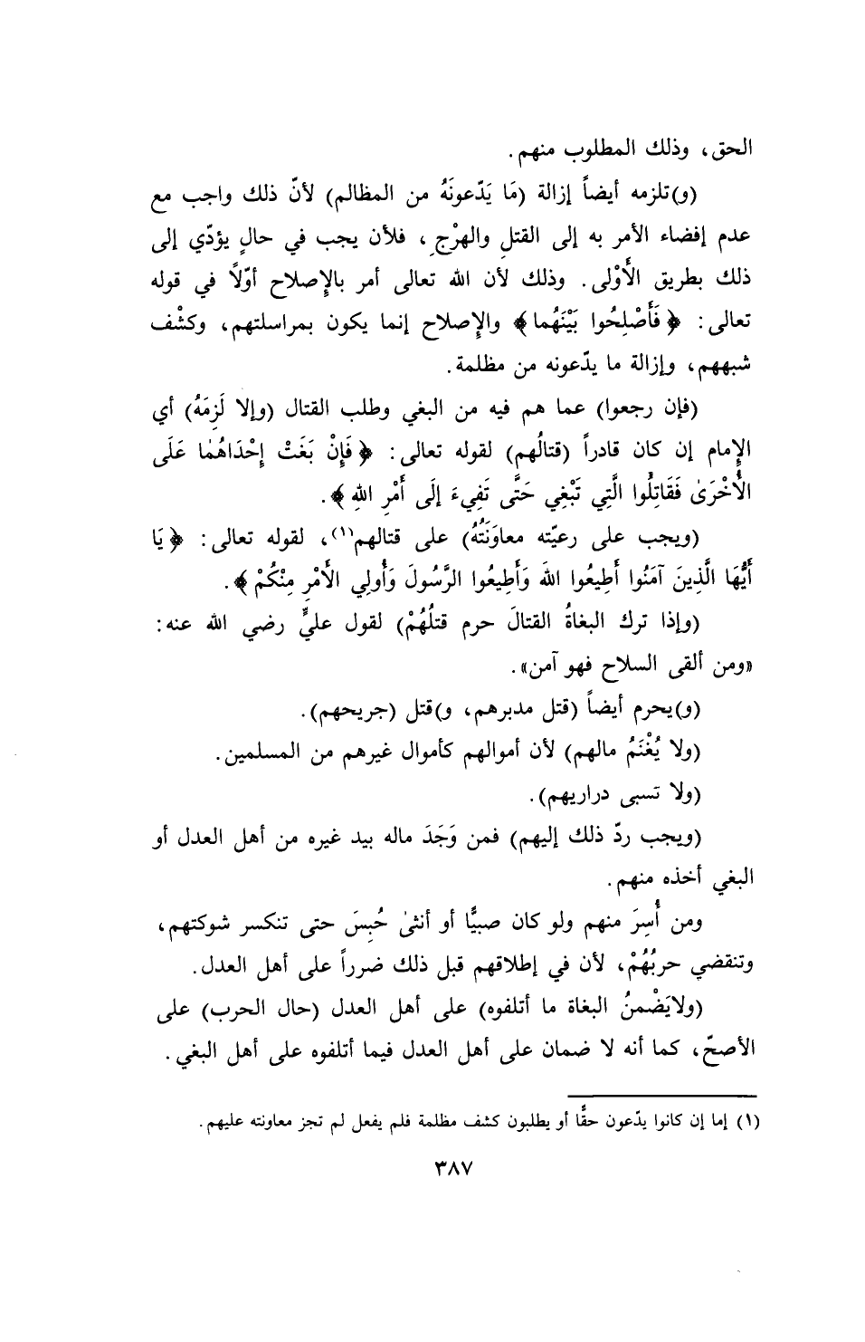 (و) تلزمه أيضاً إزالة (مَا يَدّعونَهُ من المظالم) لأنّ ذلك واجب مع عدم إفضاء الأمر به إلى القتلِ والهرْجِ، فلأن يجب في حالٍ يؤدّي إلى ذلك بطريق الأوْلى. وذلك لأن الله تعالى أمر بالإِصلاح أوَّلاً في قوله تعالى: {فَأَصْلِحُوا بَيْنَهُمَا} والإِصلاح إنما يكون بمراسلتهم، وكشْف شبههم، وإزالة ما يدّعونه من مظلمة.