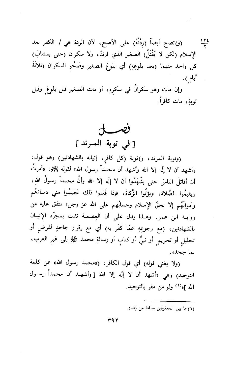 (وتوبة المرتد، و) توبة (كل كافرٍ، إتيانه بالشهادتين) وهو قول: "أشهد أن لا إله إلا الله وأشهد أن محمداً رسول الله" لقوله - صلى الله عليه وسلم -: "أمرتُ أن أقاتلَ الناسَ حتى يشْهَدُوا أن لا إله إلا الله وأنَّ محمداً رسولُ اللهِ، ويقيمُوا الصَّلاة، ويؤتُوا الزَّكاةَ، فإذا فَعَلوا ذلك عَصَمُوا مني دماءَهُم وأموالَهُم إلا بحقّ الإِسلام وحسابُهم على الله عز وجل" متفق عليه من رواية ابن عمر. وهذا يدل على أن العِصمة تثبت بمجرّد الإِتيان بالشهادتين، (مع رجوعِهِ عمّا كَفَر به) أي مع إقرار جاحدٍ لفرضٍ أو تحليلٍ أو تحريمٍ أو نبيٍّ أو كتابٍ أو رسالةِ محمد - صلى الله عليه وسلم - إلى غيرِ العرب، بما جحده.