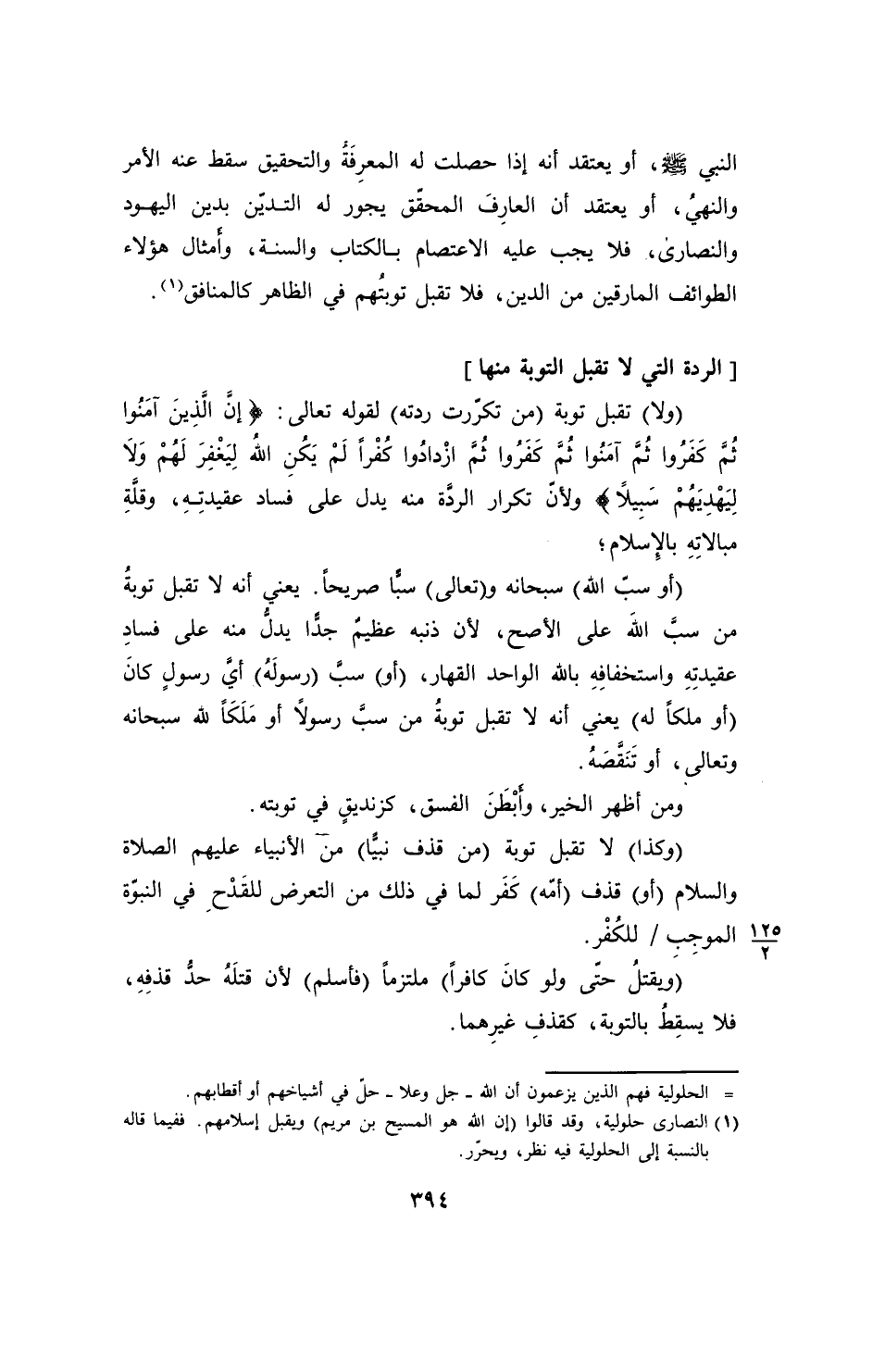 (¬1) النصارى حلولية، وقد قالوا (إن الله هو المسيح بن مريم) ويقبل إسلامهم. ففيما قاله بالنسبة إلى الحلولية فيه نظر، ويحرّر.