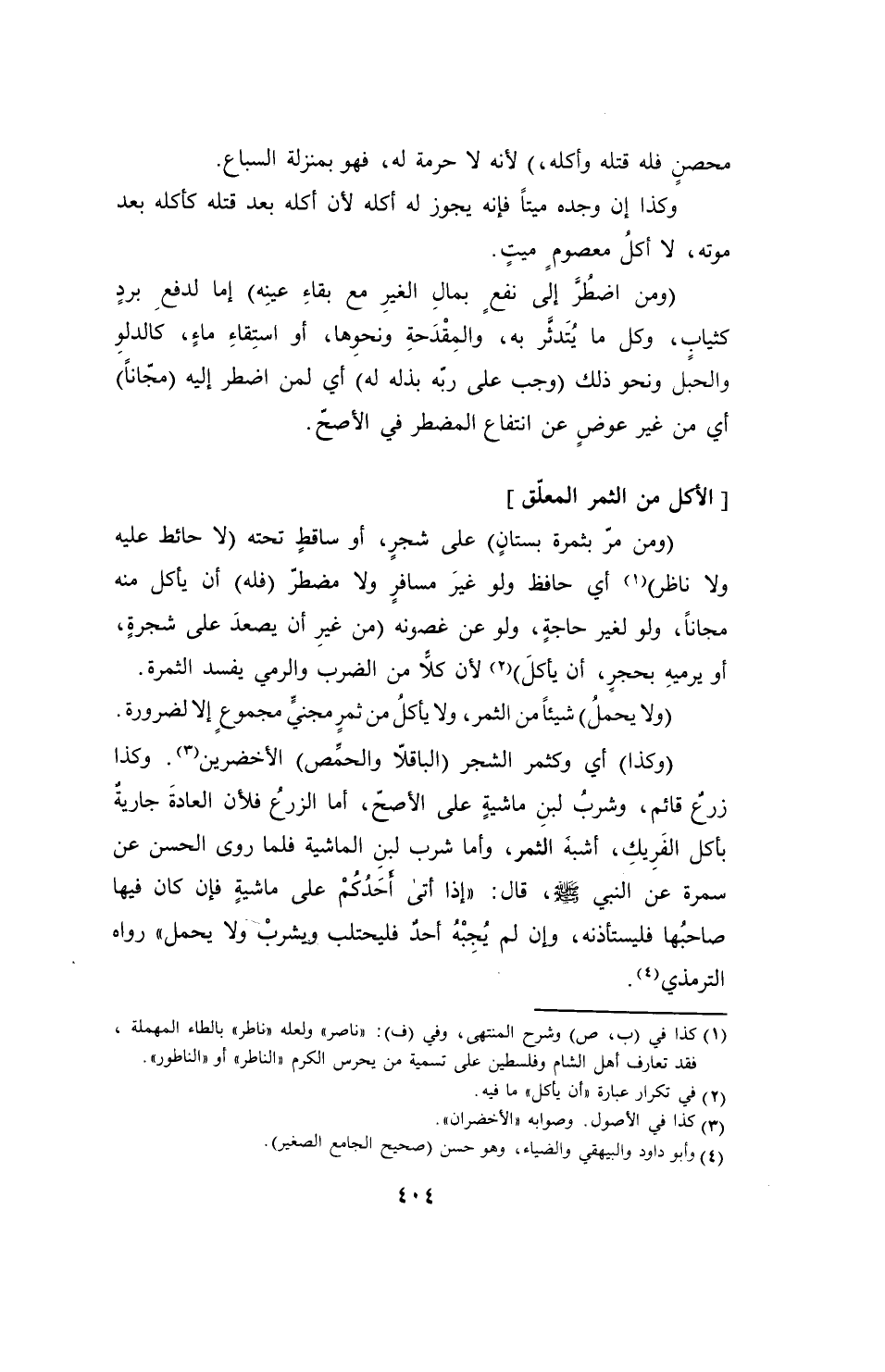 (وكذا) أي وكثمر الشجر (الباقلّا والحمِّص) الأخضرين (¬3). وكذا زرعٌ قائم، وشربُ لبنِ ماشيةٍ على الأصحّ، أما الزرعُ فلأن العادةَ جاريةٌ بأكل الفَرِيكِ، أشبه الثمر، وأما شرب لبنِ الماشية فلما روى الحسن عن سمرة عن النبي - صلى الله عليه وسلم -، قال: "إذا أتى أحَدُكمْ على ماشيةٍ فإن كان فيها صاحبُها فليستأذنه، وإن لم يُجِبْهُ أحدٌ فليحتلب ويشربْ ولا يحمل" رواه الترمذي (¬4).