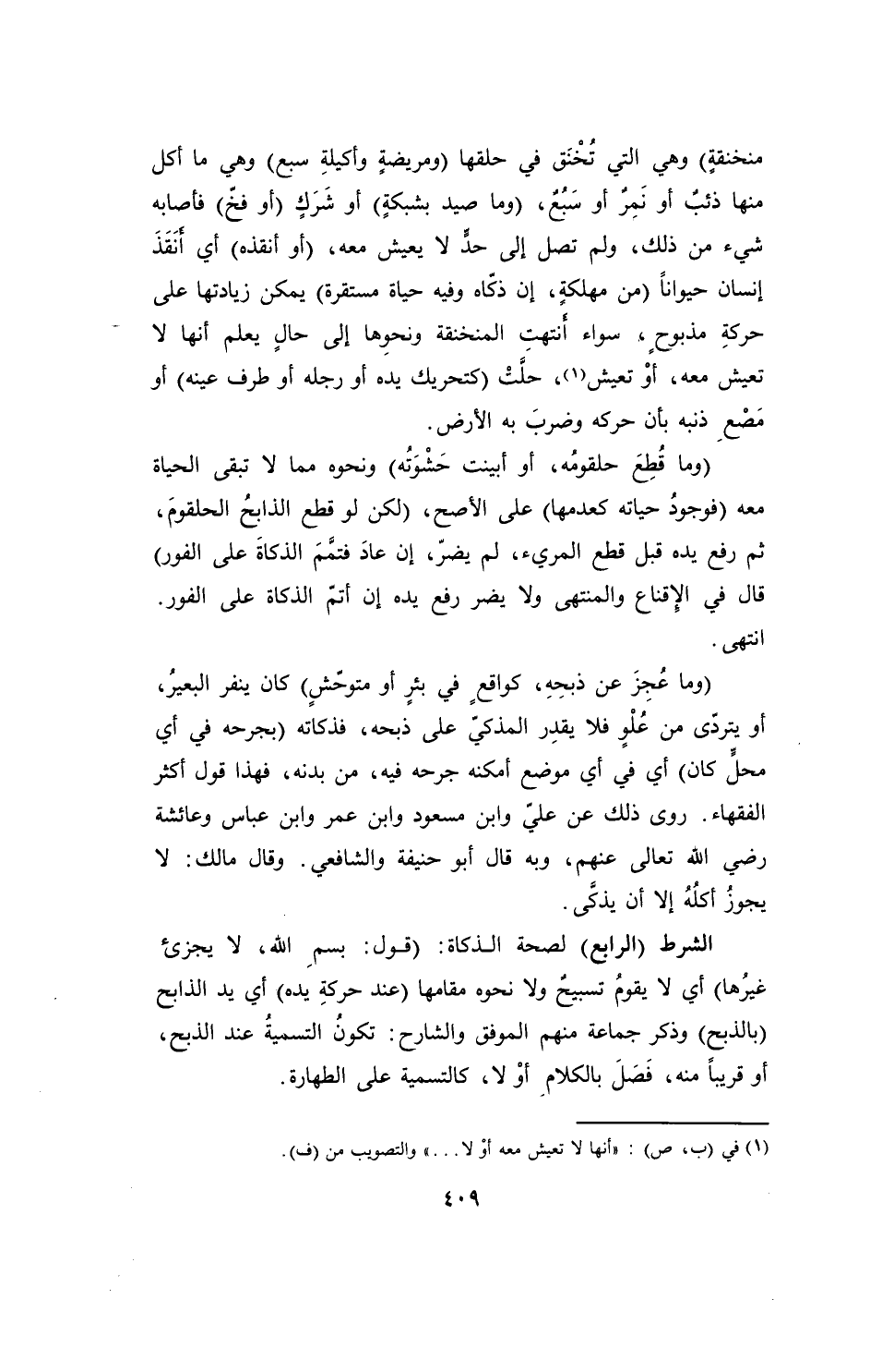 (وما قُطِعَ حلقومُه، أو أبينت حَشْوَته) ونحوه مما لا تبقى الحياة معه (فوجودُ حياته كعدمها) على الأصح، (لكن لو قطع الذابحُ الحلقومَ، ثم رفع يده قبل قطع المريء، لم يضرّ، إن عادَ فتمَّمَ الذكاةَ على الفور) قال في الإِقناع والمنتهى ولا يضر رفع يده إن أتمّ الذكاة على الفور. انتهى.