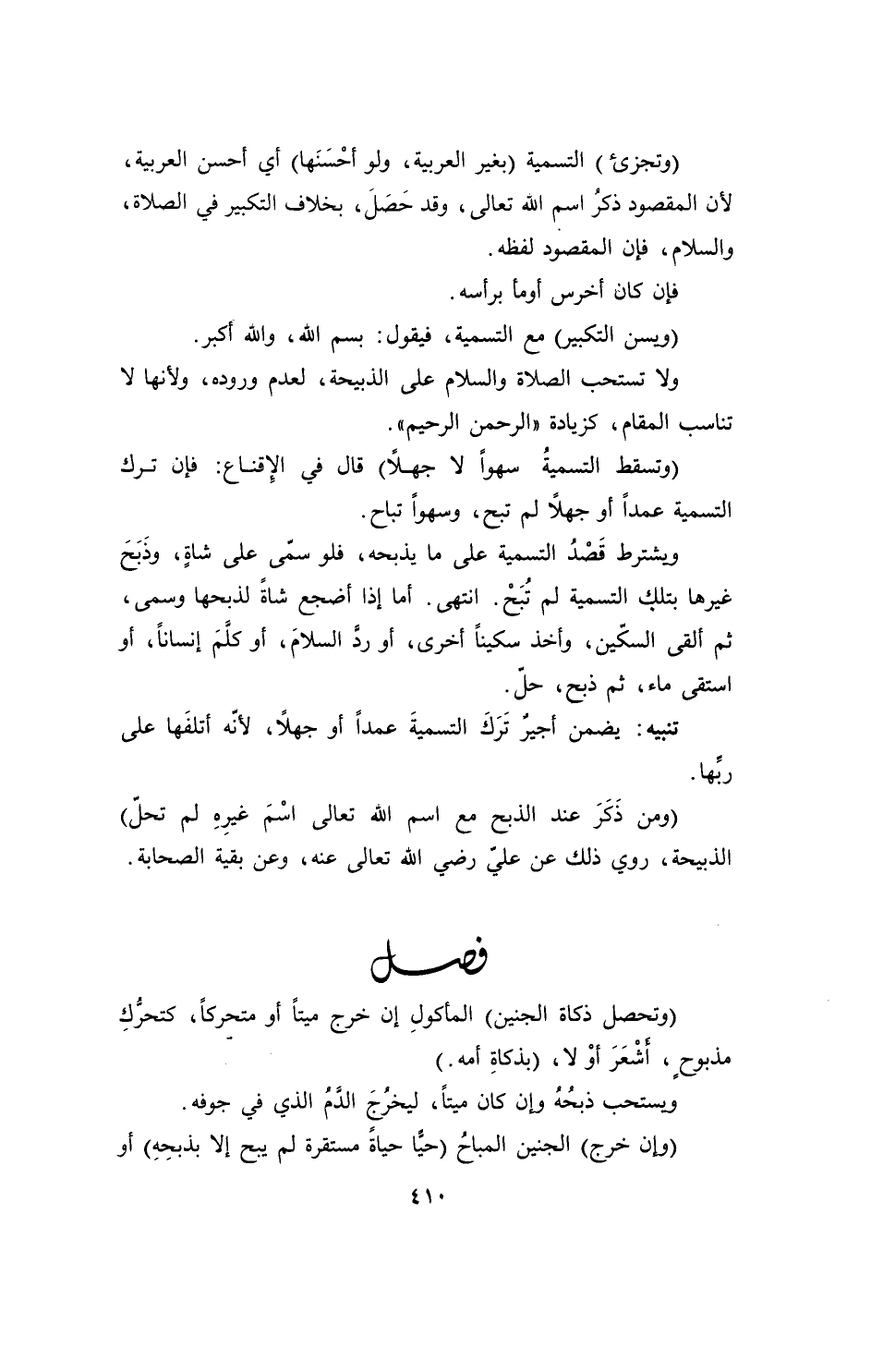 ويشترط قَصْدُ التسمية على ما يذبحه، فلو سمّى على شاةٍ، وذَبَحَ غيرها بتلك التسمية لم تُبَحْ. انتهى. أما إذا أضجع شاةً لذبحها وسمى، ثم ألقى السكّين، وأخذ سكيناً أخرى، أو ردَّ السلامَ، أو كلَّمَ إنساناً، أو استقى ماء، ثم ذبح، حلّ.