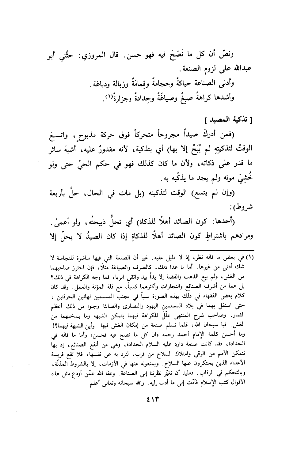 (¬1) في بعض ما قاله نظر، إذ لا دليل عليه. غير أن الصنعة التي فيها مباشرة للنجاسة لا شك أدنى من غيرها. أما ما عدا ذلك، كالصرف والصياغة مثلاً، فإن احترز صاحبهما من الغش، ولم يبع الذهب والفضة إلا يداً بيد واتقى الربا، فما وجه الكراهة في ذلك؟ بل هما من أشرف الصنائع والتجارات وأكثرهما كسباً، مع قلة المؤنة والعمل. وقد كان كلام بعض الفقهاء في ذلك بهذه الصورة سبباً في تجنب المسلمين لهاتين الحرفتين، حتى استقل بهما في بلاد المسلمين اليهود والنصارى والصابئة وجنوا من ذلك أعظم الثمار. وصاحب شرح المنتهى علَّلَ للكراهة فيهما بتمكن الشبهة وما يدخلهما من الغش. فيا سبحان الله، قلما تسلم صنعة من إمكان الغش فيها. وأين الشبهة فيهما؟! وما أحسن كلمة الإمام أحمد رحمه الله "إن كل ما نصح فيه فحسن" وأما ما قاله في الحدادة، فقد كانت صنعة داود عليه السلام الحدادة، وهي من أنفع الصنائع، إذ بها تتمكن الأمم من الرقي وامتلاك السلاح من قرب، لترد به عن نفسها، فلا تقع فريسة الأعداء الذين يحتكرون عنها السلاح. ويمنعونه عنها في الأزمات، إلا بالشروط المذلّة، وبالتحكم في الرقاب. فعلينا أن نغيّر نظرتنا إلى الصناعة. وعفا الله عمّن أودع مثل هذه الأقوال كتب الإسلام فأدّت إلى ما أدت إليه. والله سبحانه وتعالى أعلم.