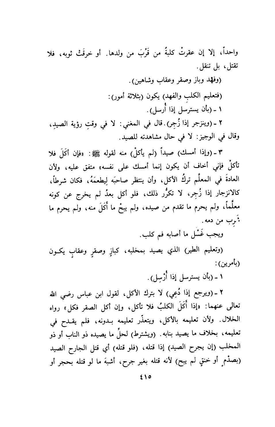 2 - (ويرجع إذا دُعِي) لا بترك الأكل، لقول ابن عباس رضي الله تعالى عنهما: "إذا أكَلَ الكلبُ فلا تأكل، وإن أكل الصقر فكل" رواه الخلال. ولأن تعليمه بالأكل، ويتعذّر تعليمه بدونه، فلم يقدح في تعليمه، بخلاف ما يصيد بنابه. (ويشترط) لحلِّ ما يصيده ذو الناب أو ذو المخلب (إن يجرح الصيد) إذا قتله، (فلو قتله) أي قتل الجارح الصيد (بصدْمٍ أو خنقٍ لم يبح) لأنه قتله بغير جرح، أشبهَ ما لو قتله بحجر أو