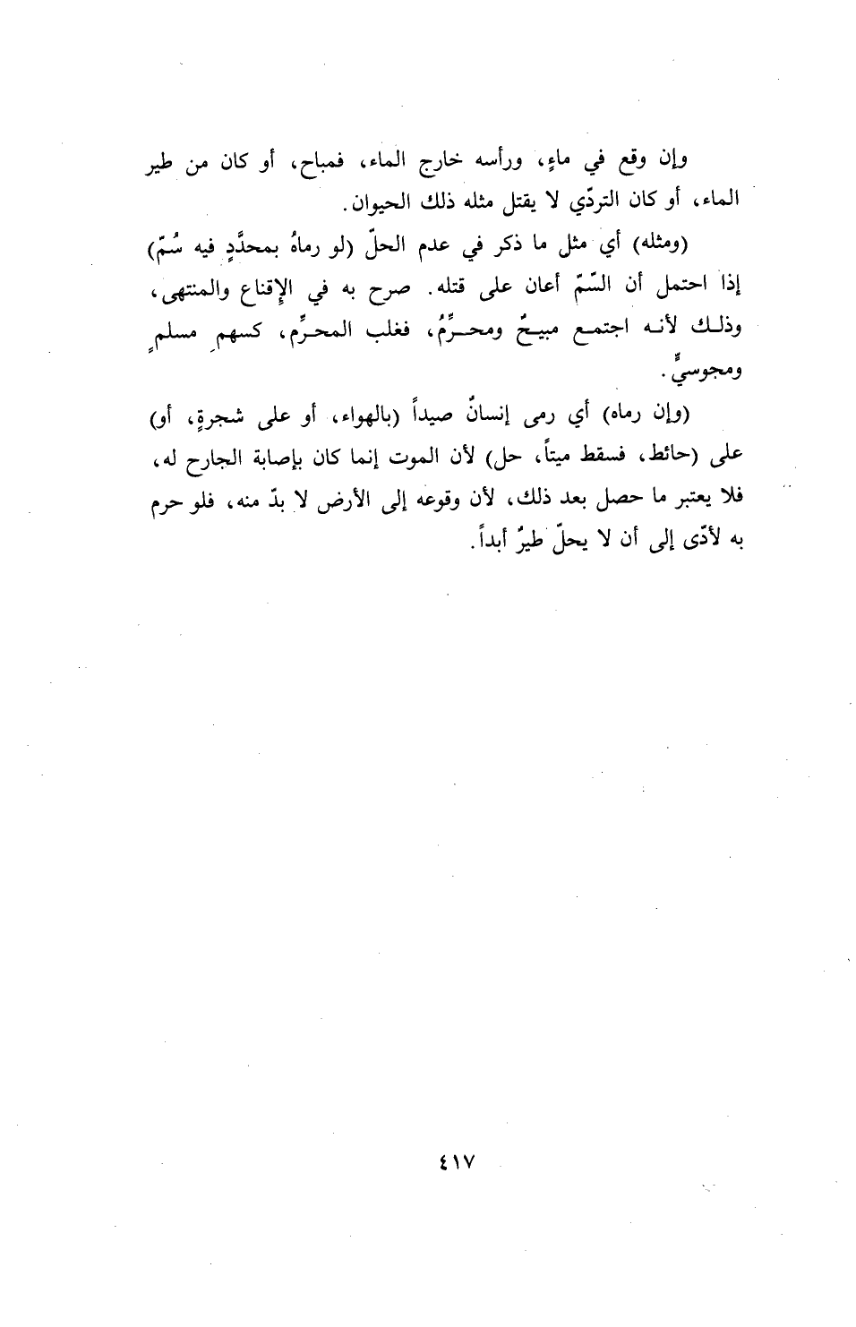 (ومثله) أي مثل ما ذكر في عدم الحلّ (لو رماهُ بمحدَّدٍ فيه سُمّ) إذا احتمل أن السّمّ أعان على قتله. صرح به في الإِقناع والمنتهى، وذلك لأنه اجتمع مبيحٌ ومحرِّمُ، فغلب المحرِّم، كسهمِ مسلمٍ ومجوسيٍّ.