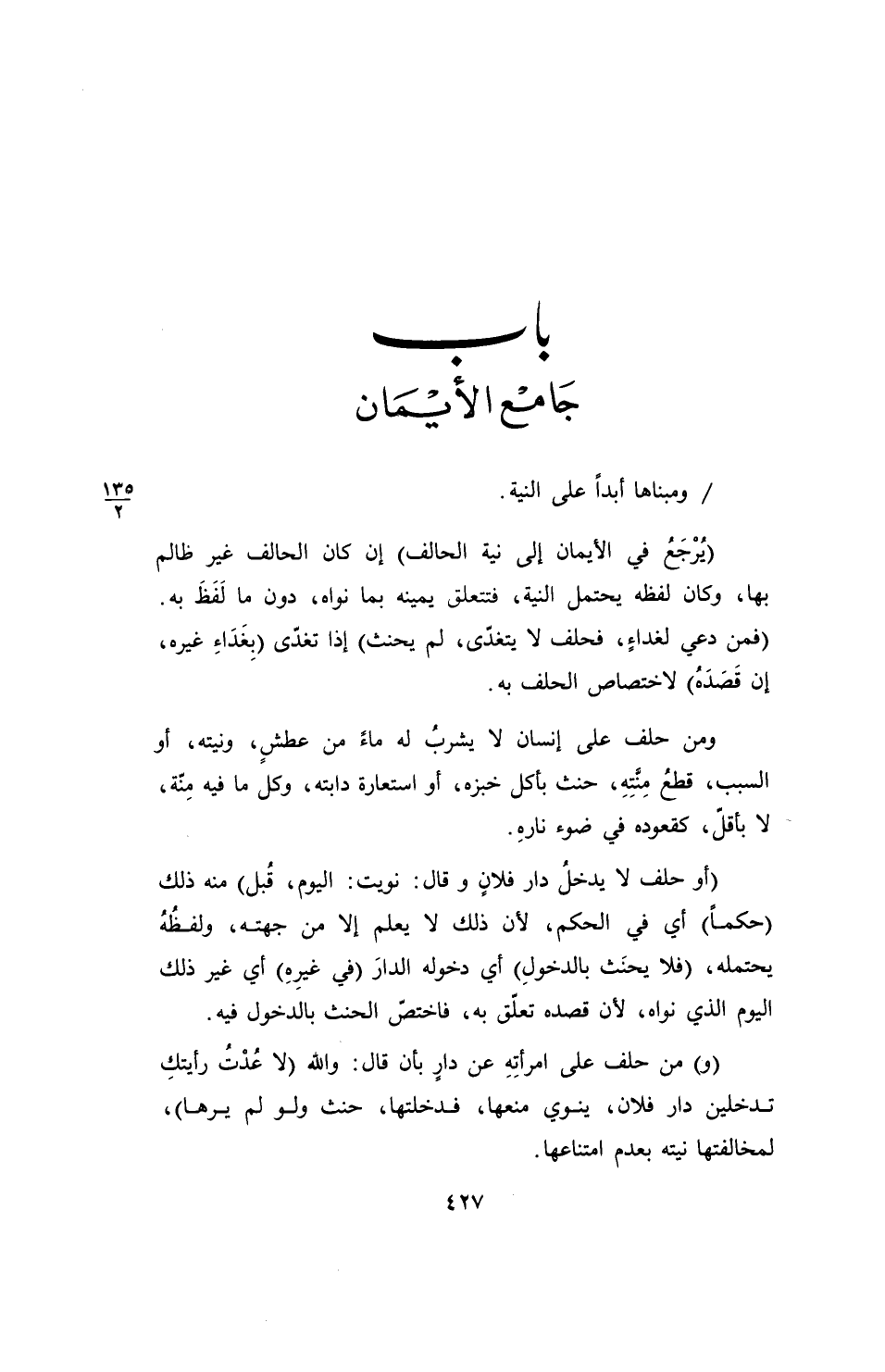 (يُرْجَعُ في الأيمان إلى نيّة الحالف) إن كان الحالف غير ظالم بها، وكان لفظه يحتمل النية، فتتعلق يمينه بما نواه، دون ما لَفَظَ به. (فمن دعي لغداءٍ، فحلف لا يتغدّى، لم يحنث) إذا تغدّى (بِغَدَاءِ غيره، إن قَصَدَهُ) لاختصاص الحلف به.