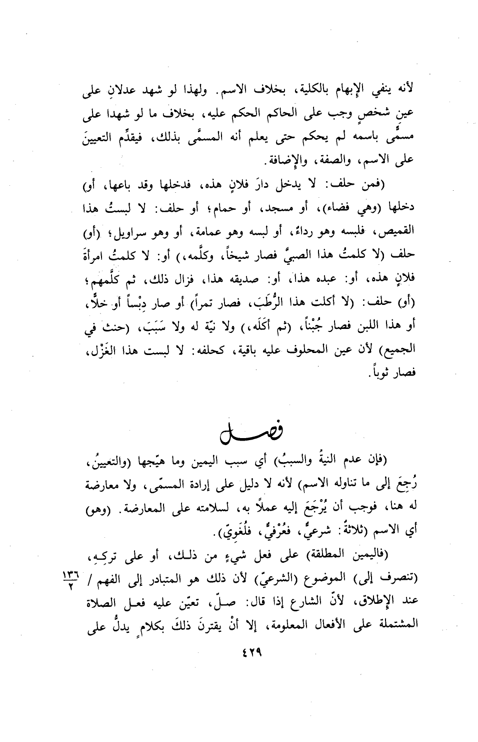 (فاليمين المطلقة) على فعل شيءٍ من ذلك، أو على تركِهِ، (تنصرف إلى) الموضوع (الشرعيّ) لأن ذلك هو المتبادر إلى الفهم عند الإِطلاق، لأنّ الشارع إذا قال: صلّ، تعيّن عليه فعل الصلاة المشتملة على الأفعال المعلومة، إلا أنْ يقترنَ ذلكَ بكلامٍ يدلُّ على