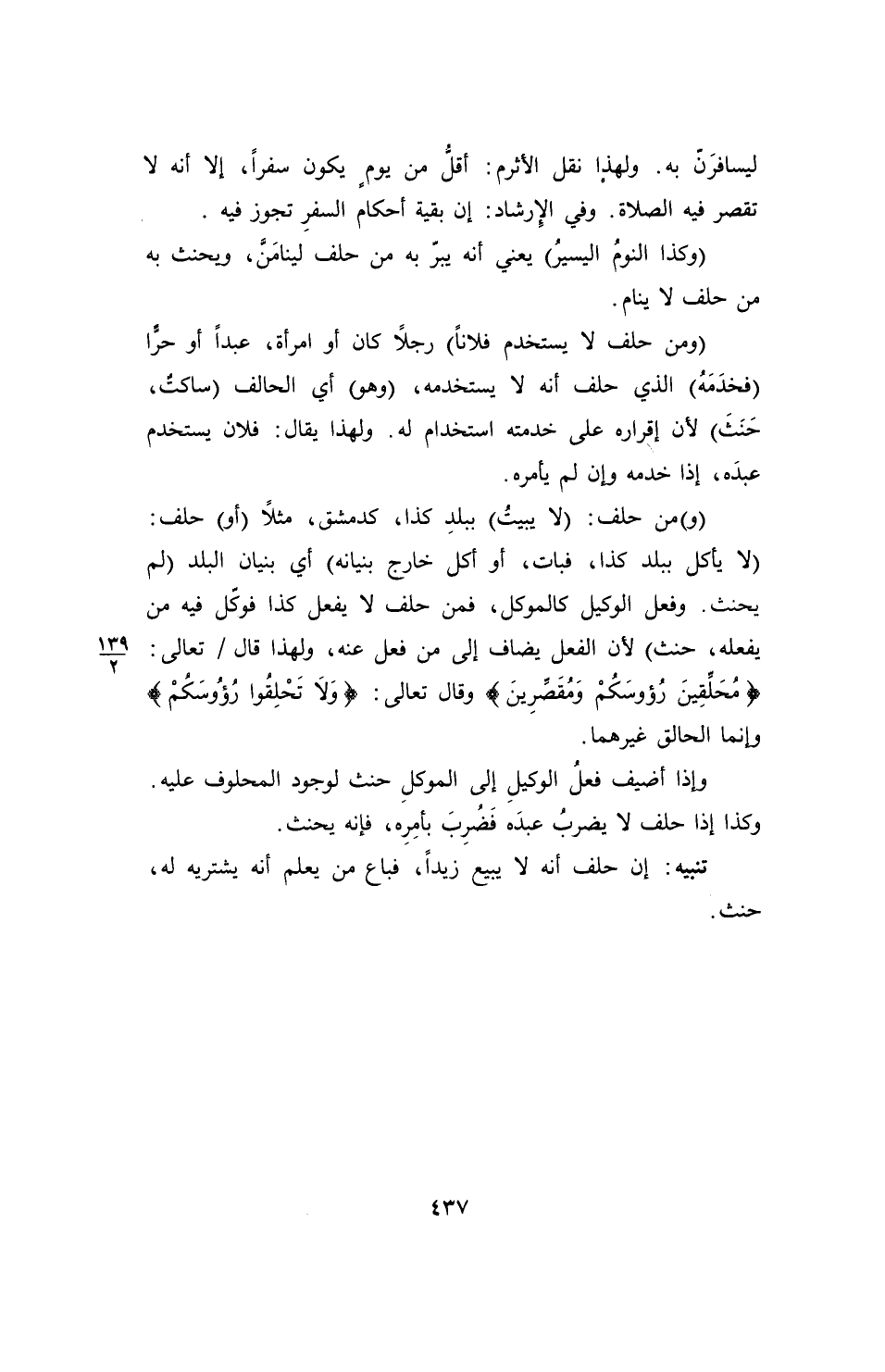 (و) من حلف: (لا يبيتُ) ببلدِ كذا، كدمشق، مثلاً (أو) حلف: (لا يأكل ببلد كذا، فبات، أو أكل خارج بنيانه) أي بنيان البلد (لم يحنث. وفعل الوكيل كالموكل، فمن حلف لا يفعل كذا فوكّل فيه من يفعله، حنث) لأن الفعل يضاف إلى من فعل عنه، ولهذا قال تعالى: {مُحَلِّقِينَ رُؤوسَكُمْ وَمُقَصِّرِينَ} وقال تعالى: {وَلَا تَحْلِقُوا رُؤُوسَكُمْ} وإنما الحالق غيرهما.