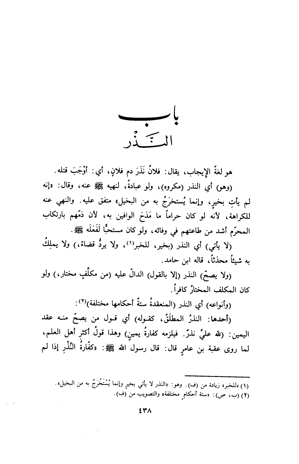 (¬1) "للخبر" زيادة من (ف). وهو: "النذر لا يأتي بخيرٍ وإنما يُسْتَخْرَجُ به من البخيل".