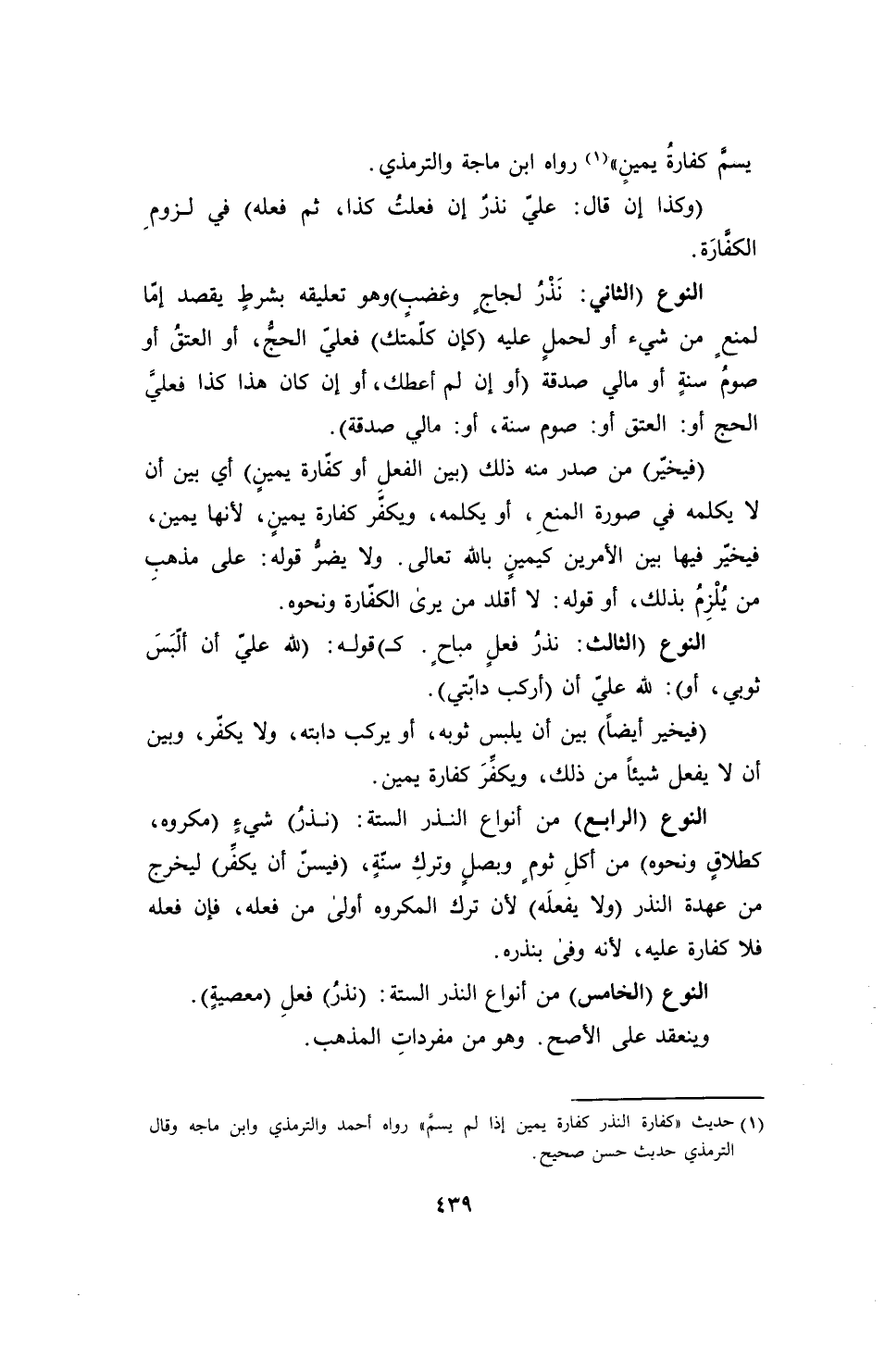 (¬1) حديث "كفارة النذر كفارة يمين إذا لم يسمّ" رواه أحمد والترمذي وابن ماجه وقال الترمذي حديث حسن صحيح.