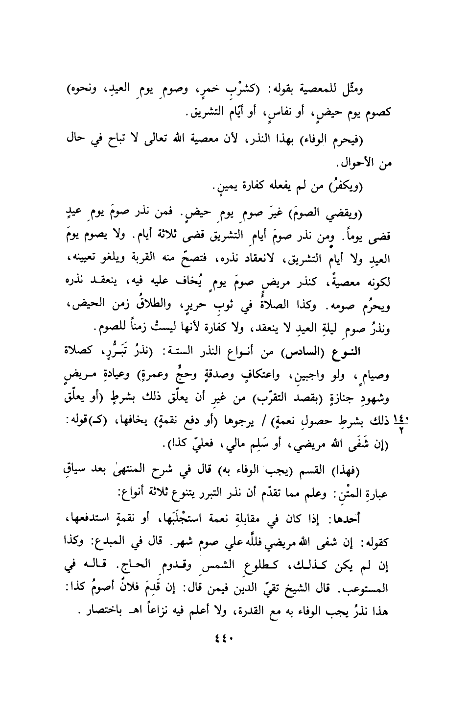 (ويقضي الصومَ) غيرَ صوم يومِ حيضٍ. فمن نذر صومَ يومِ عيدٍ قضى يوماً. ومن نذر صومَ أيامِ التشريق قضى ثلاثة أيام. ولا يصوم يومَ العيدِ ولا أيام التشريق، لانعقاد نذره، فتصحّ منه القربة ويلغو تعيينه، لكونه معصيةً، كنذر مريضٍ صومَ يوم يُخاف عليه فيه، ينعقد نذره ويحرُم صومه. وكذا الصلاةُ في ثوب حريرٍ، والطلاقُ زمن الحيض، ونذرُ صوم ليلةِ العيدِ لا ينعقد، ولا كفَارة لأنها ليستْ زمناً للصوم.